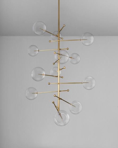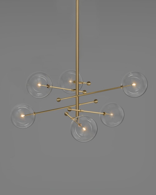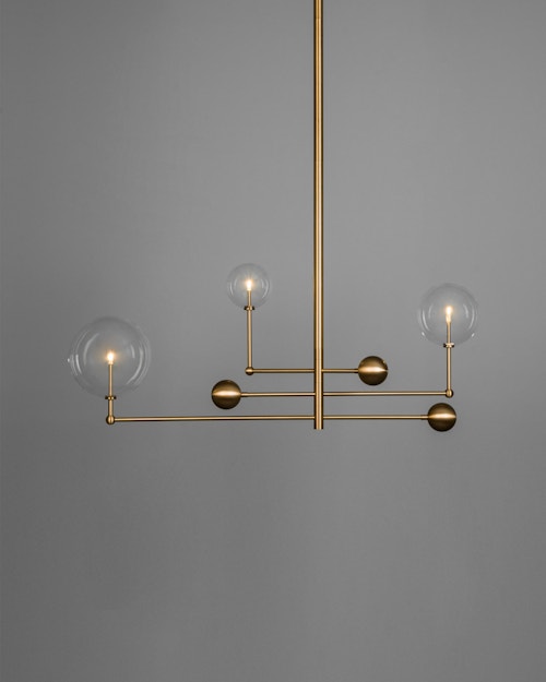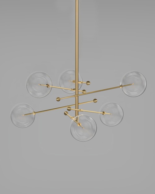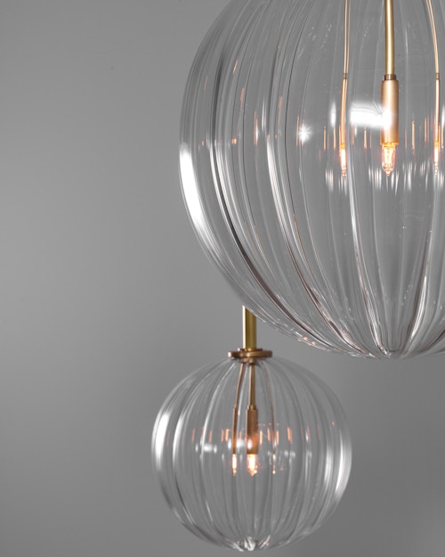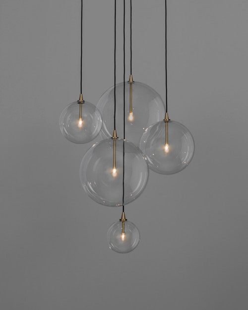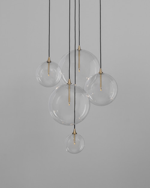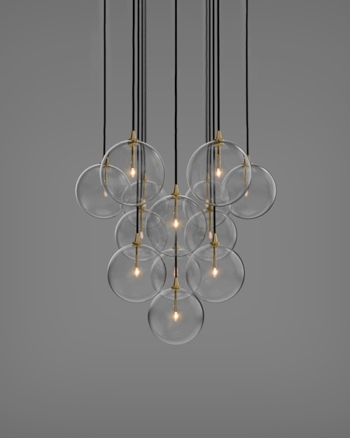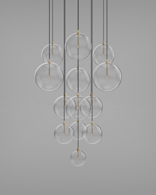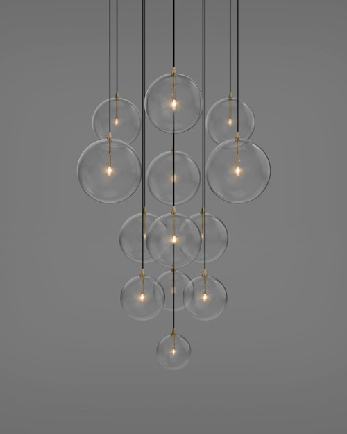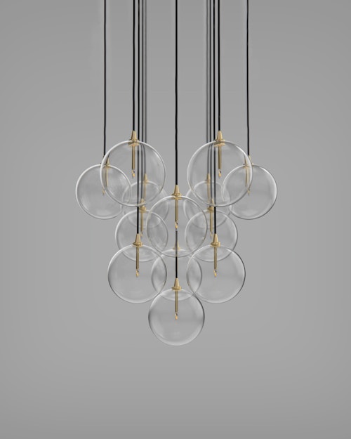 Striking illuminated arrangements, the Schwung Classics are constellations of brass and glass. Carefully crafted in Poland, the precision of shape and material amplifies their arresting crisp quality of light. Made in the tradition of Bohemian glass, with its lineage in Central Europe for over a century; highly durable borosilicate glass is blown into thin, durable transparent globes, intensifying minimal brass fixtures with an irresistible sparkle.