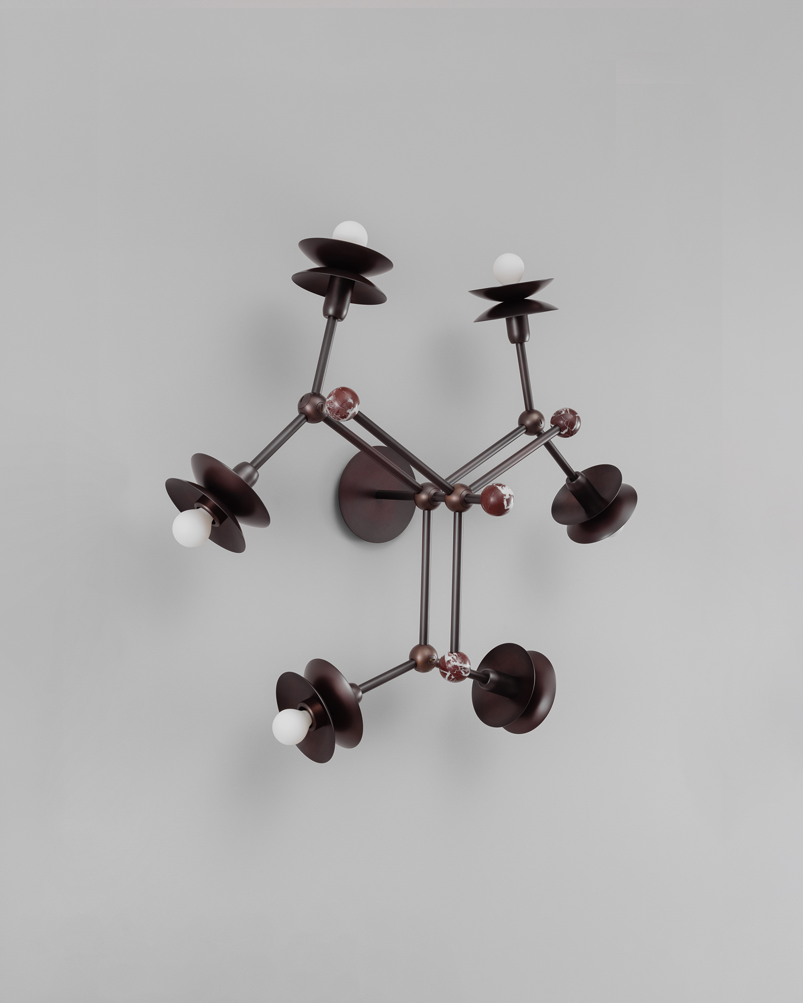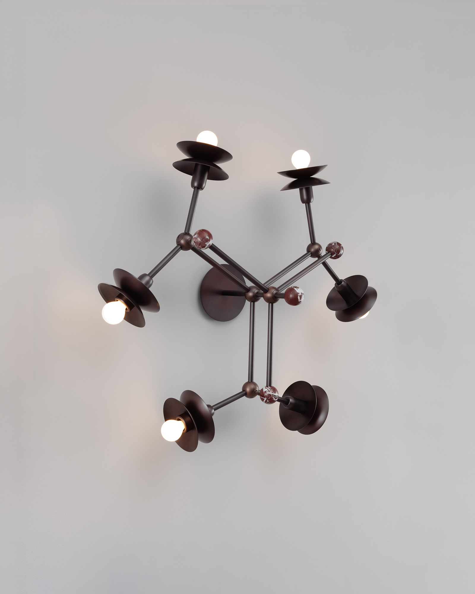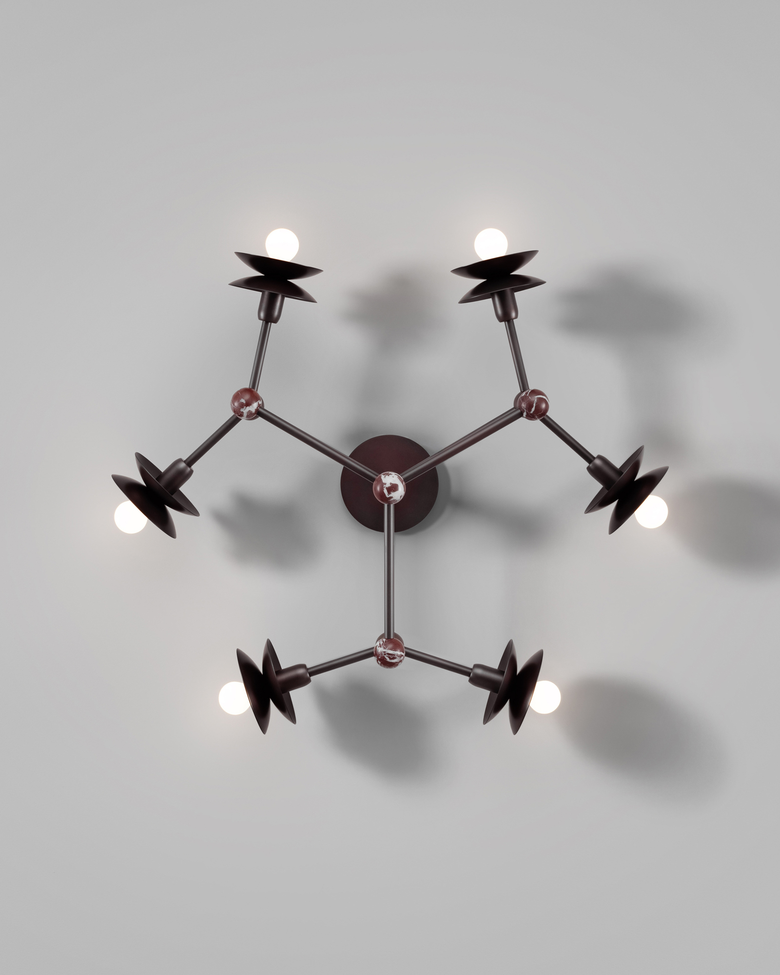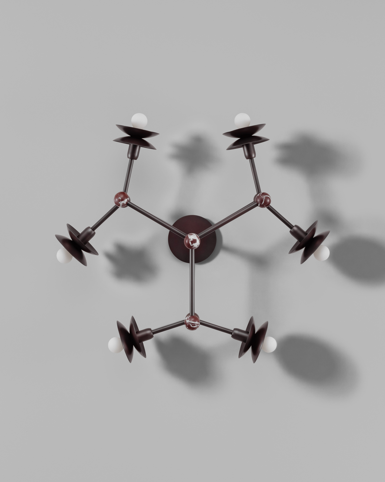 Radiance above, obduracy below, two countenances of one presence. Within the chiselled grammar of cuneiform, three arms unfurl from a single spine, each bearing twin lights. Beneath them, three further arms cradle a solitary marble sphere apiece. A set of opposites fixed flush to a ceiling or wall; light and stone in an inverted axis mundi. Rendered in four pairings of hand-crafted brass and marble, mirrorwise.