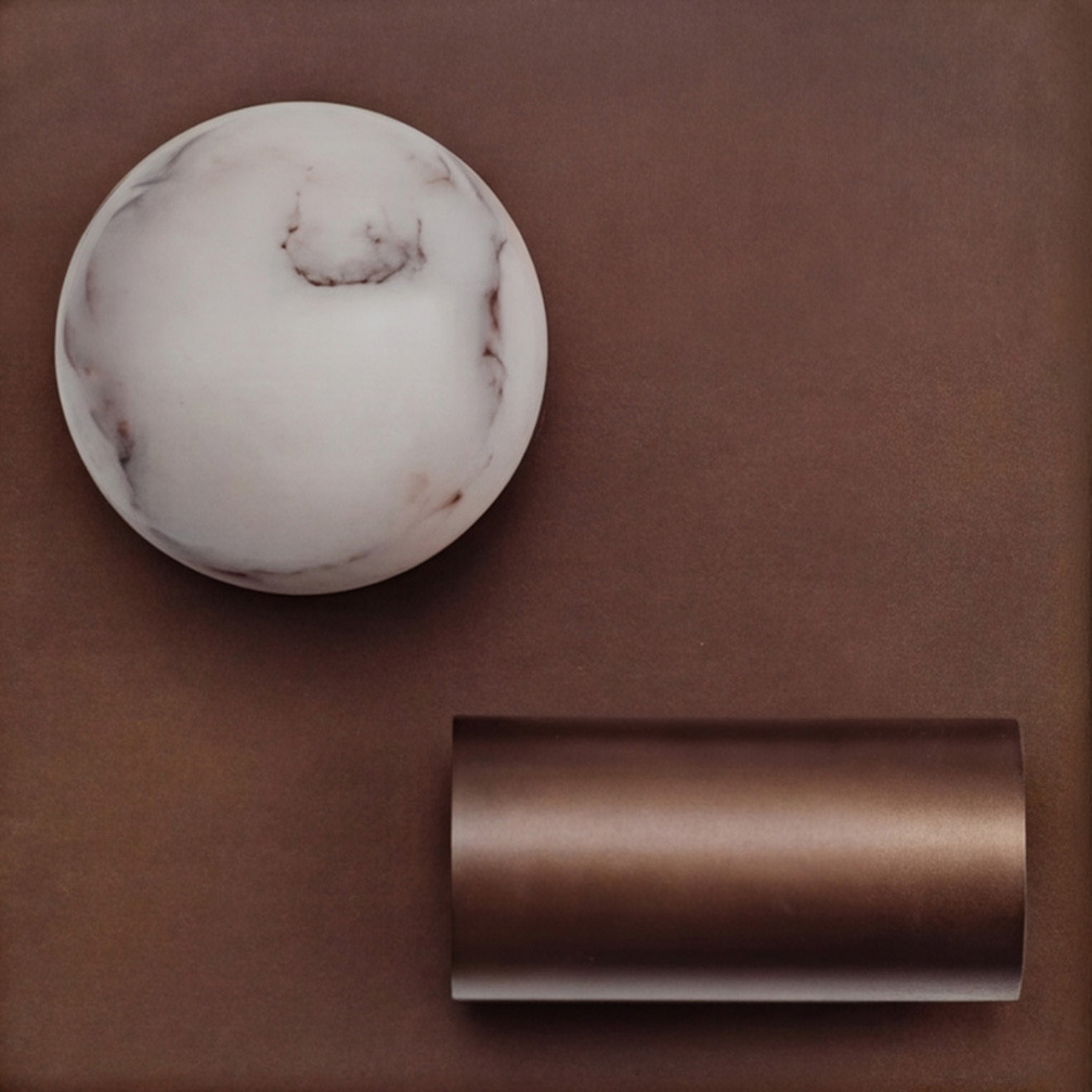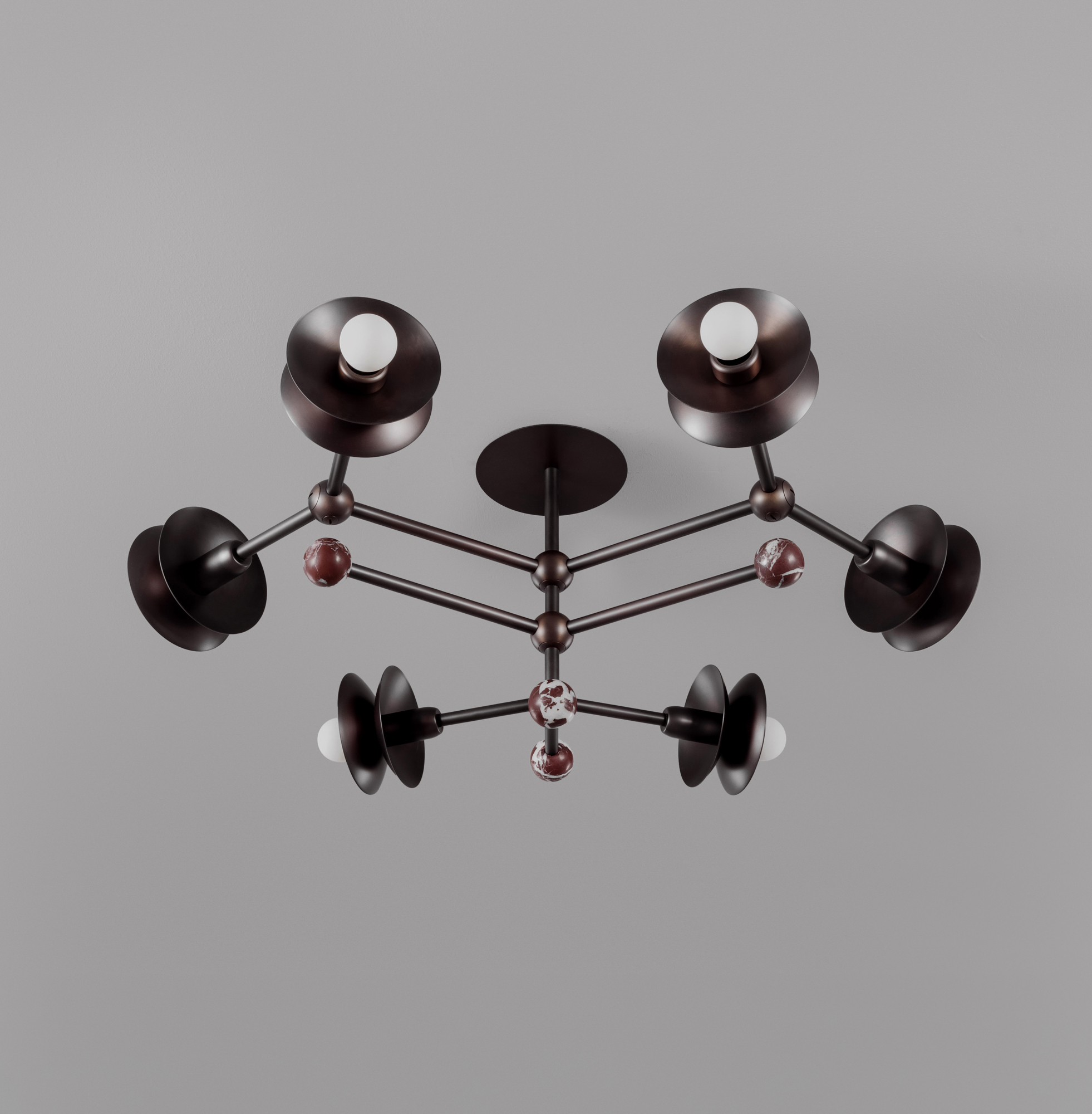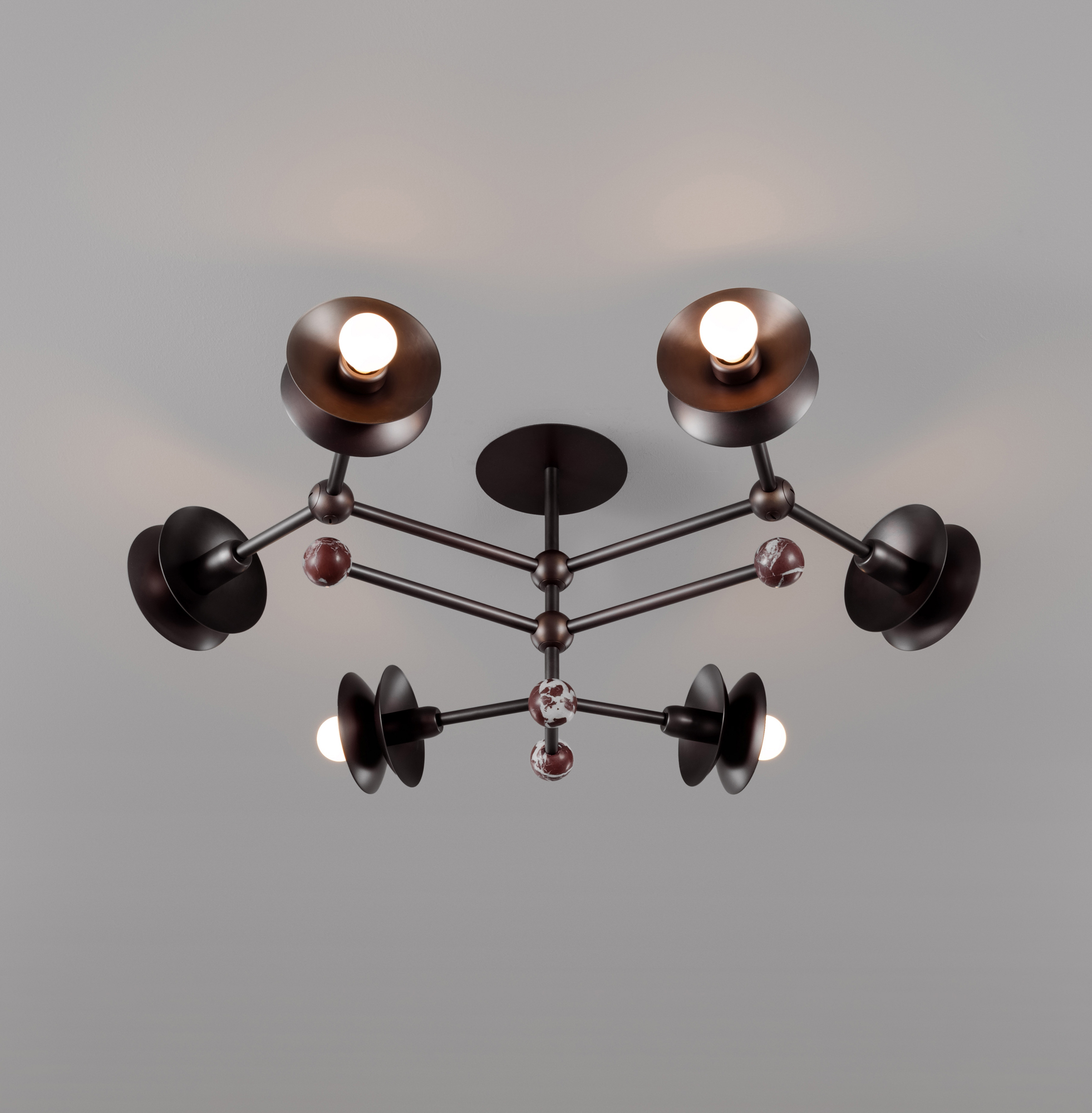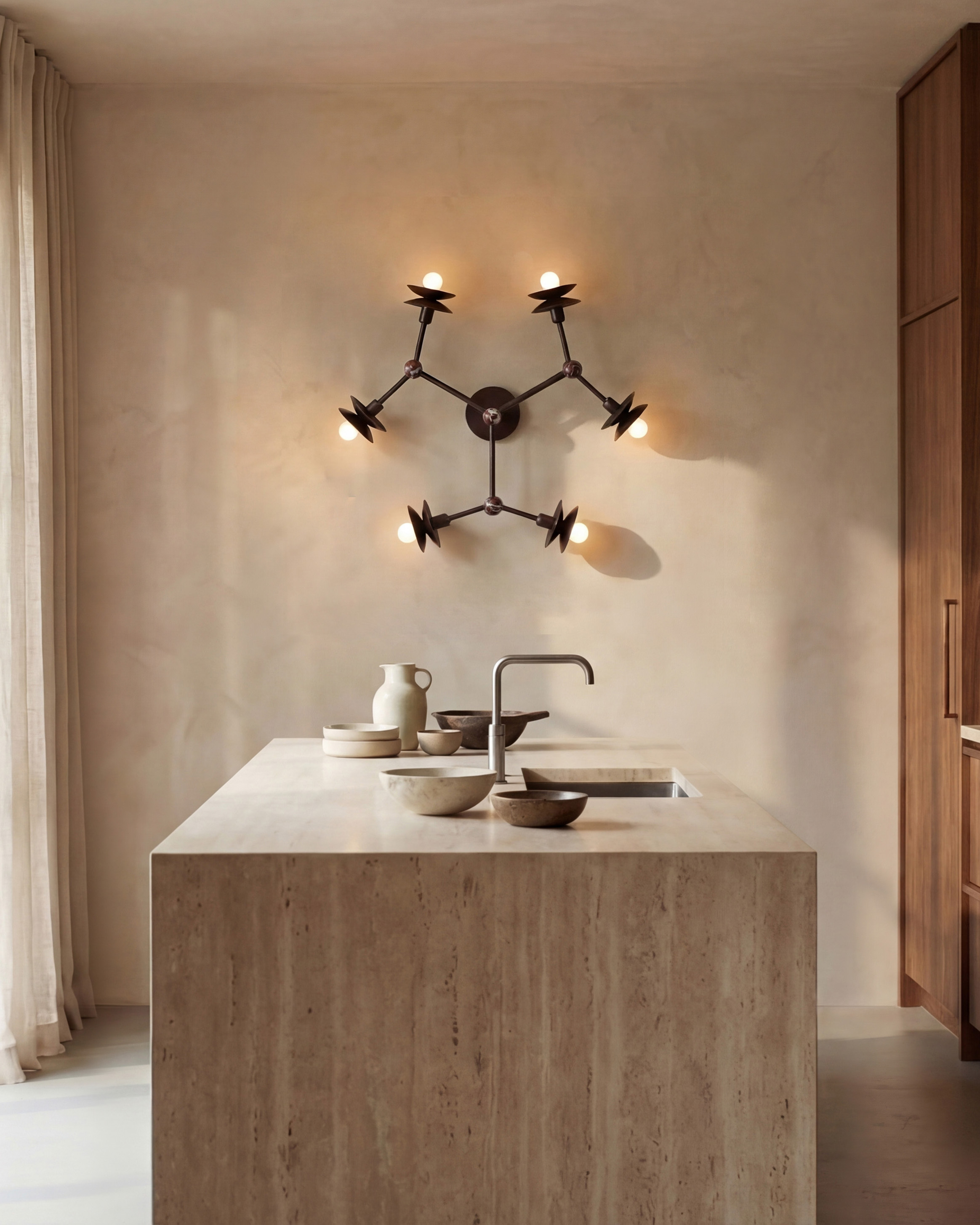 Radiance above, obduracy below, two countenances of one presence. Within the chiselled grammar of cuneiform, three arms unfurl from a single spine, each bearing twin lights. Beneath them, three further arms cradle a solitary marble sphere apiece. A set of opposites fixed flush to a ceiling or wall; light and stone in an inverted axis mundi. Rendered in four pairings of hand-crafted brass and marble, mirrorwise.