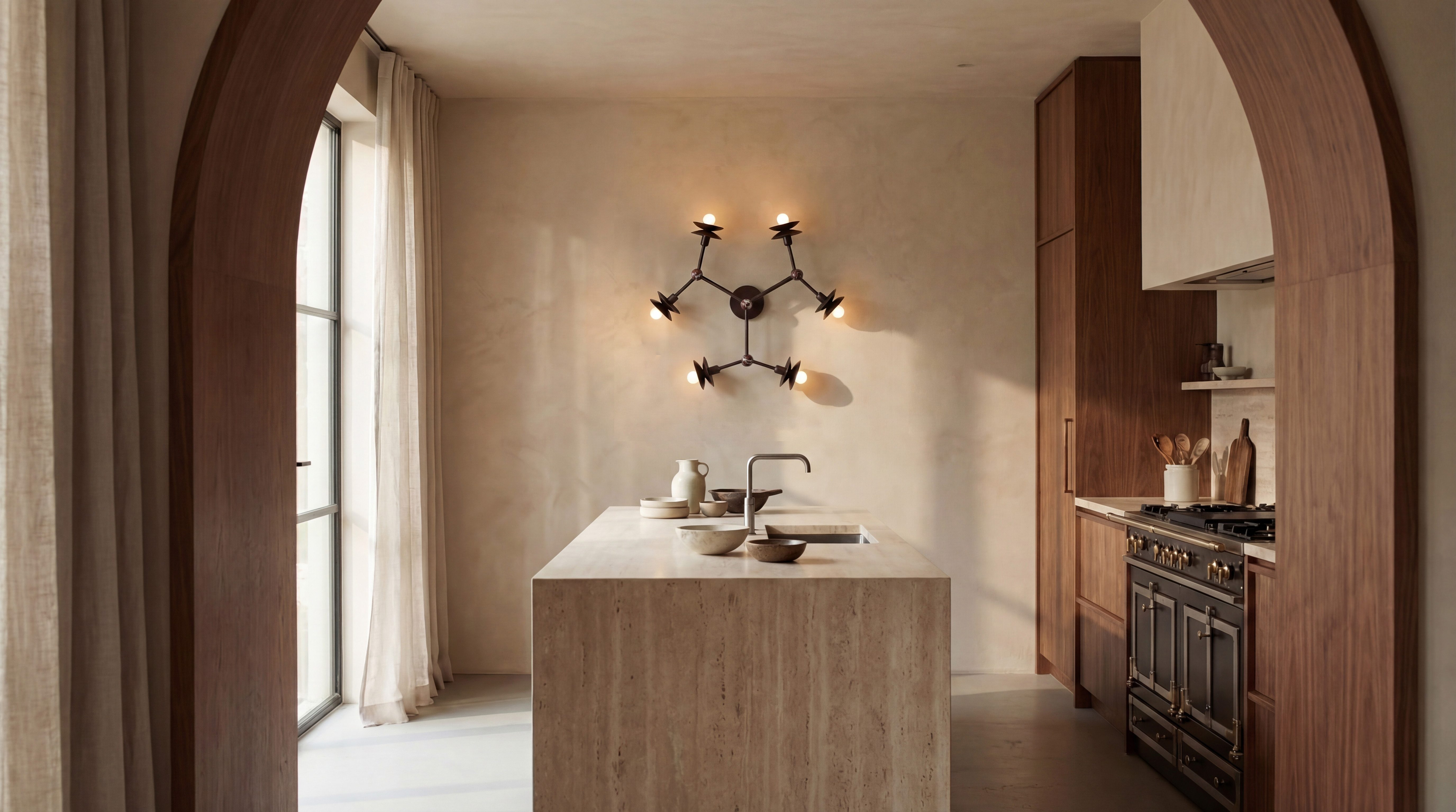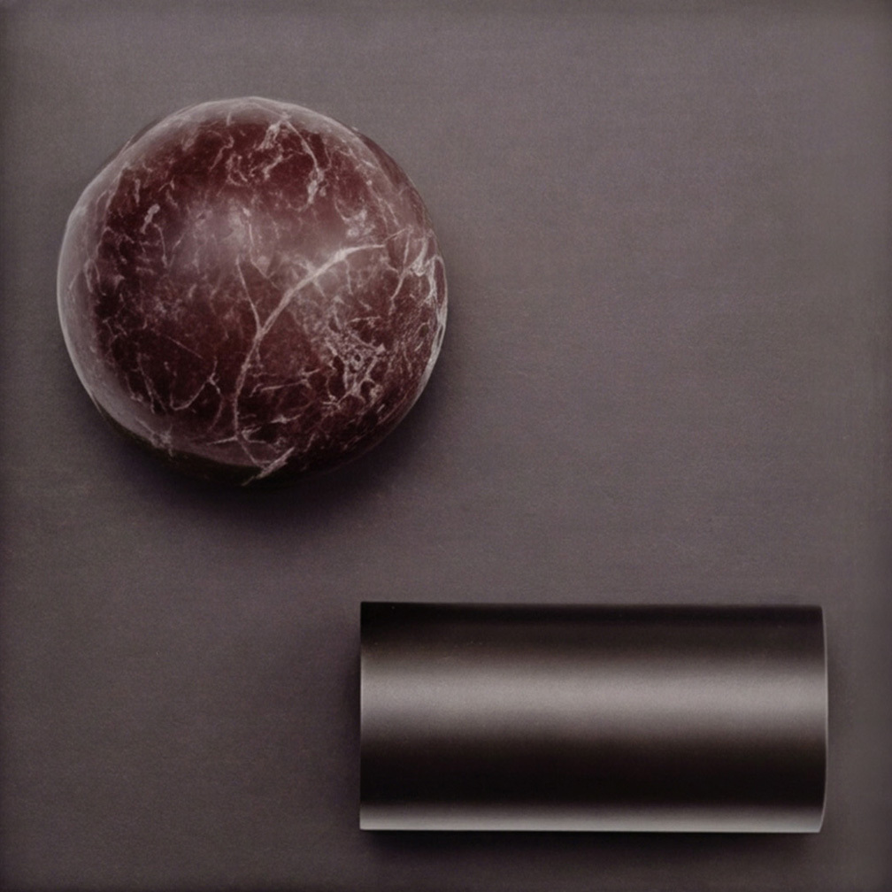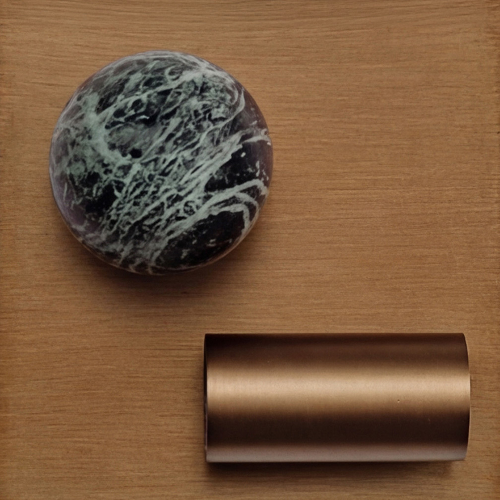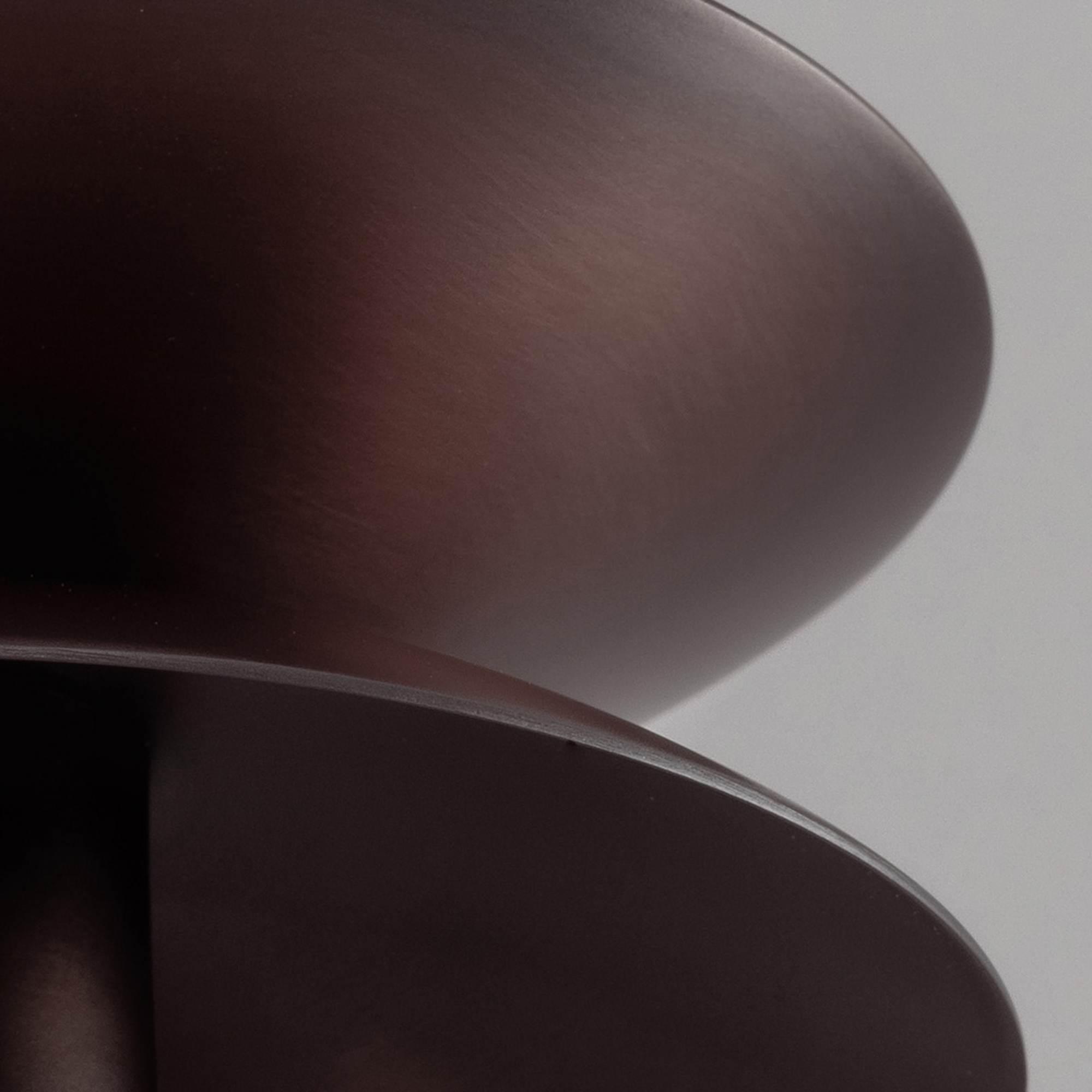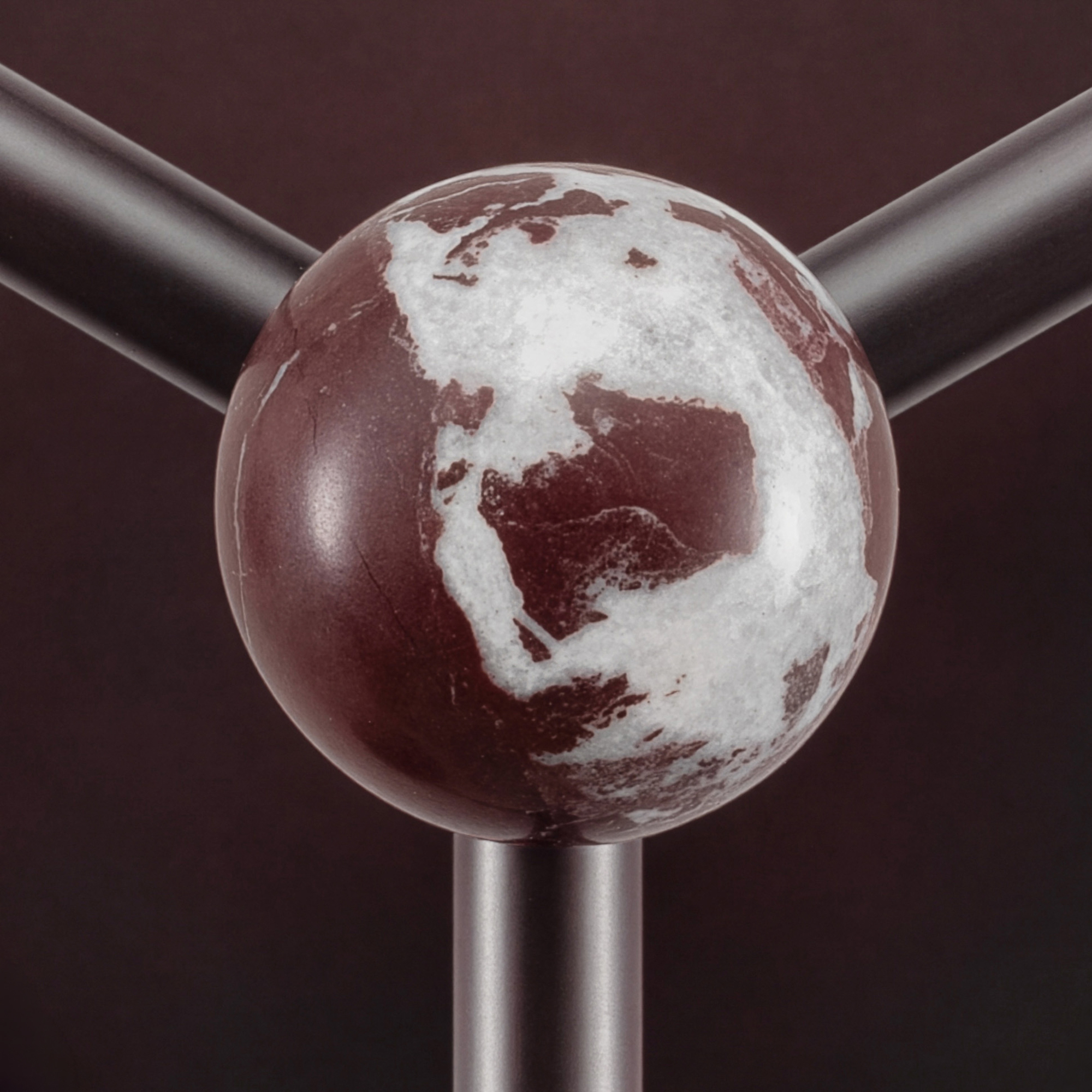 Radiance above, obduracy below, two countenances of one presence. Within the chiselled grammar of cuneiform, three arms unfurl from a single spine, each bearing twin lights. Beneath them, three further arms cradle a solitary marble sphere apiece. A set of opposites fixed flush to a ceiling or wall; light and stone in an inverted axis mundi. Rendered in four pairings of hand-crafted brass and marble, mirrorwise.