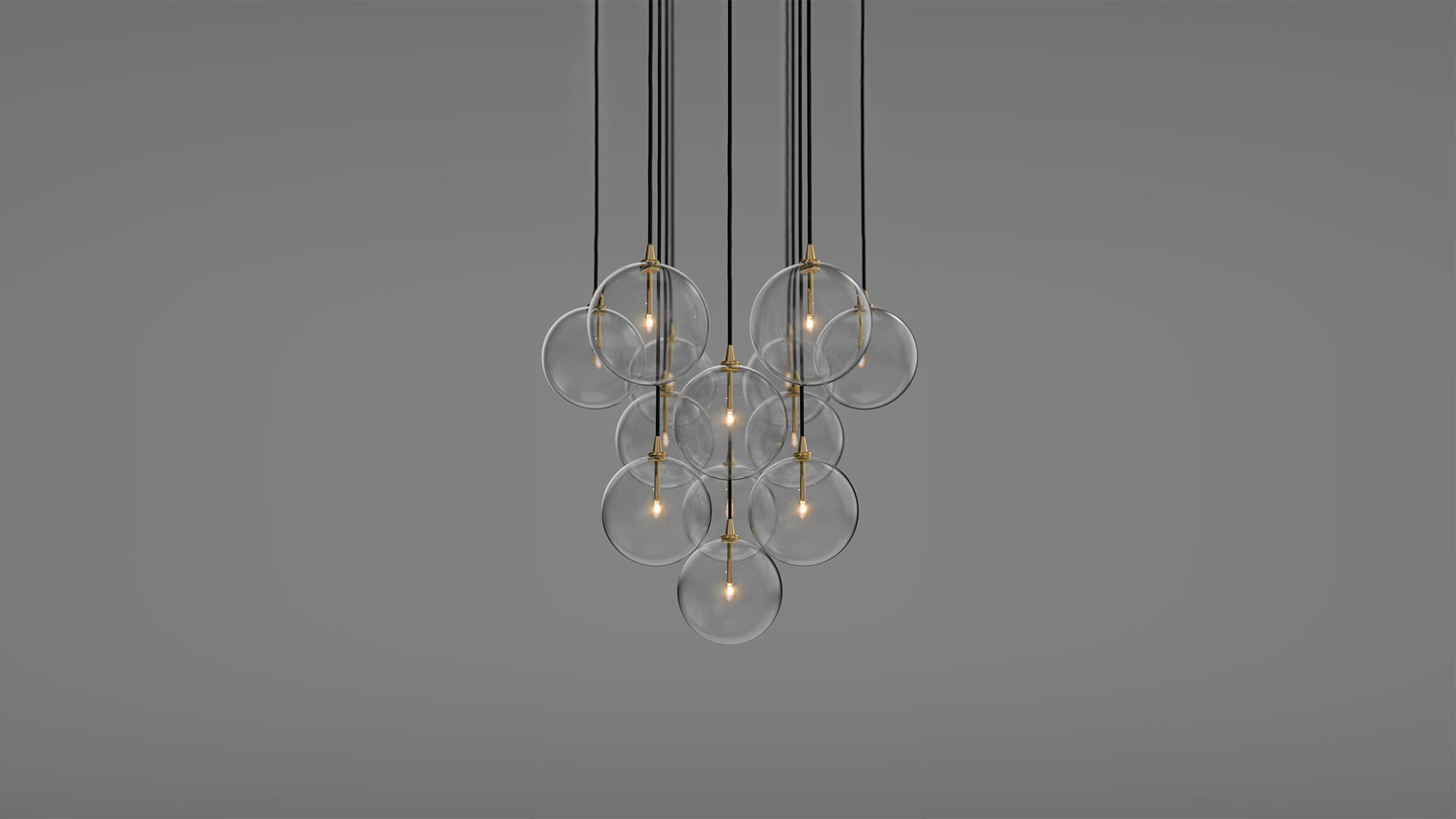 An arrangement of thirteen glass globes suspended from a discus of brass forms a serene ceiling constellation. The repeated sphere appears like a bundle of grapes, a tantalizing cluster floating in the air.