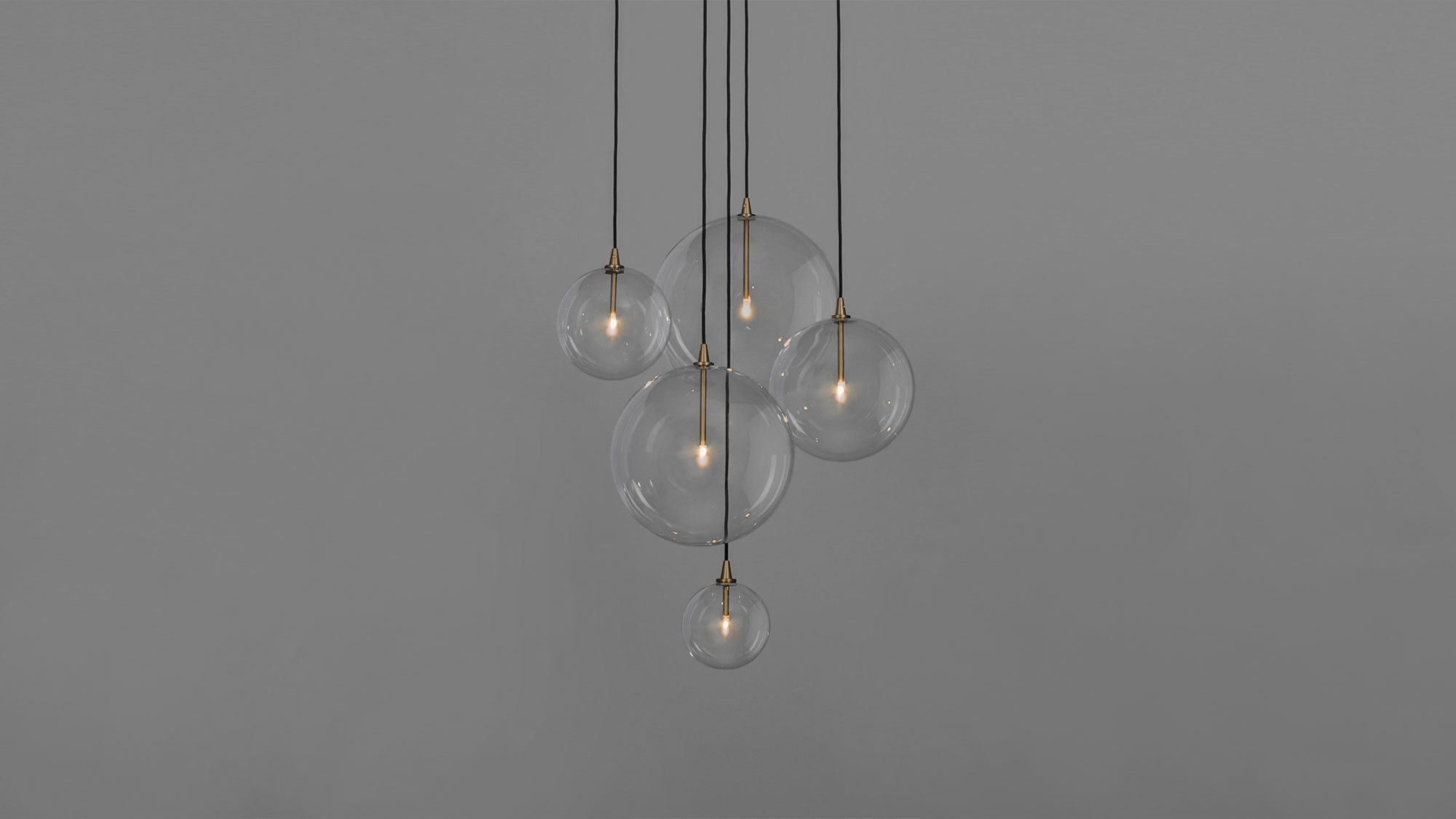 An arrangement of five glass globes suspended from a discus of brass forms a serene ceiling constellation. A range of diameters creates the impression of a flock of spontaneous soap bubbles, floating weightlessly in the air.