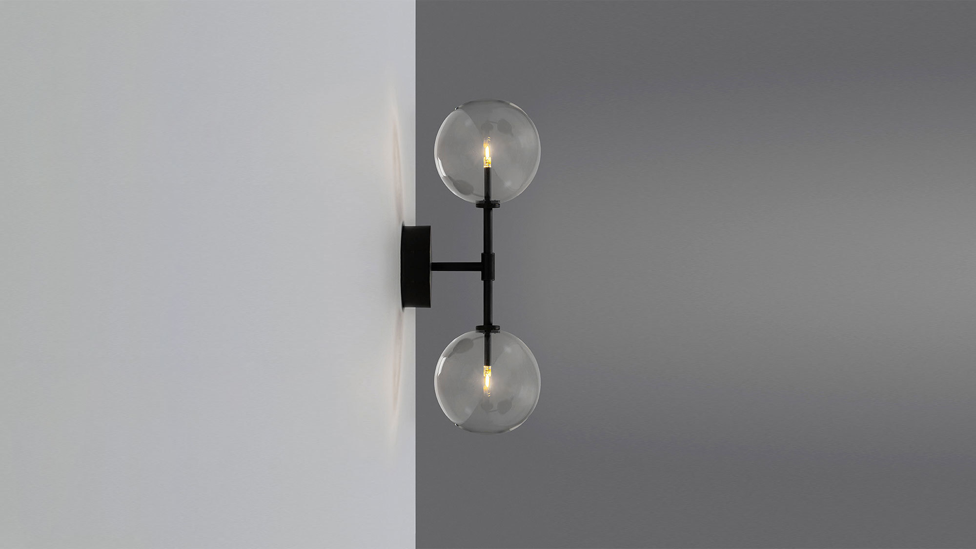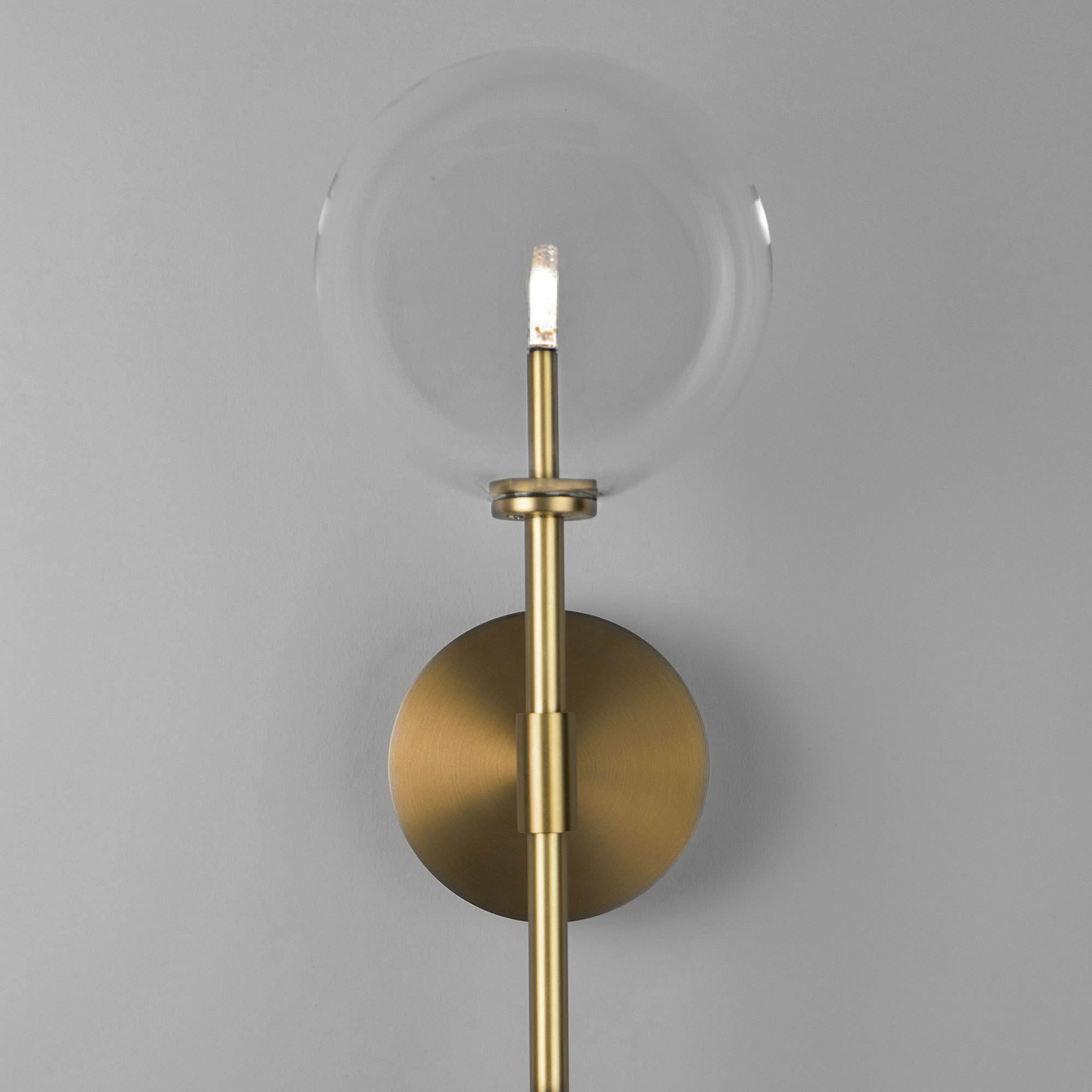 A vision of daybreak- the Dawn wall sconces take their name from the clarity of early morning light. With an airy presence, this wall sconce is rendered in contemporary brass and glass.