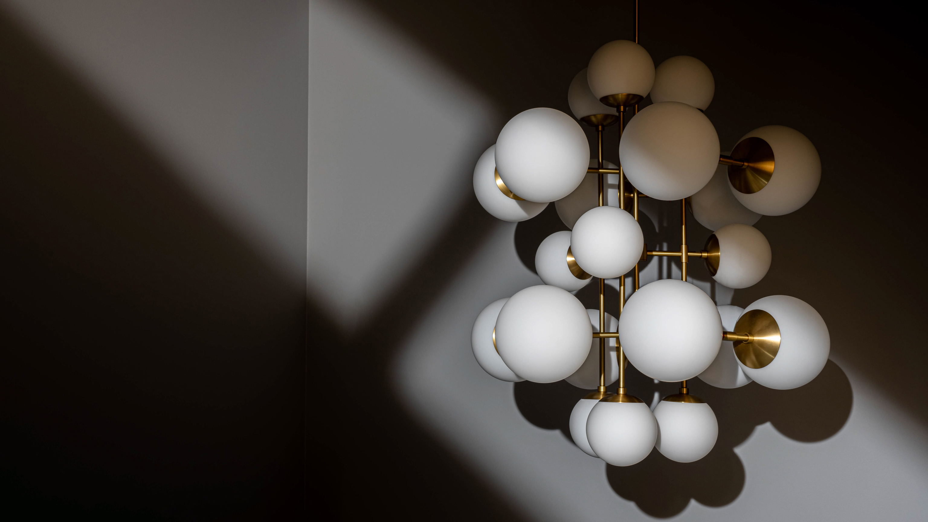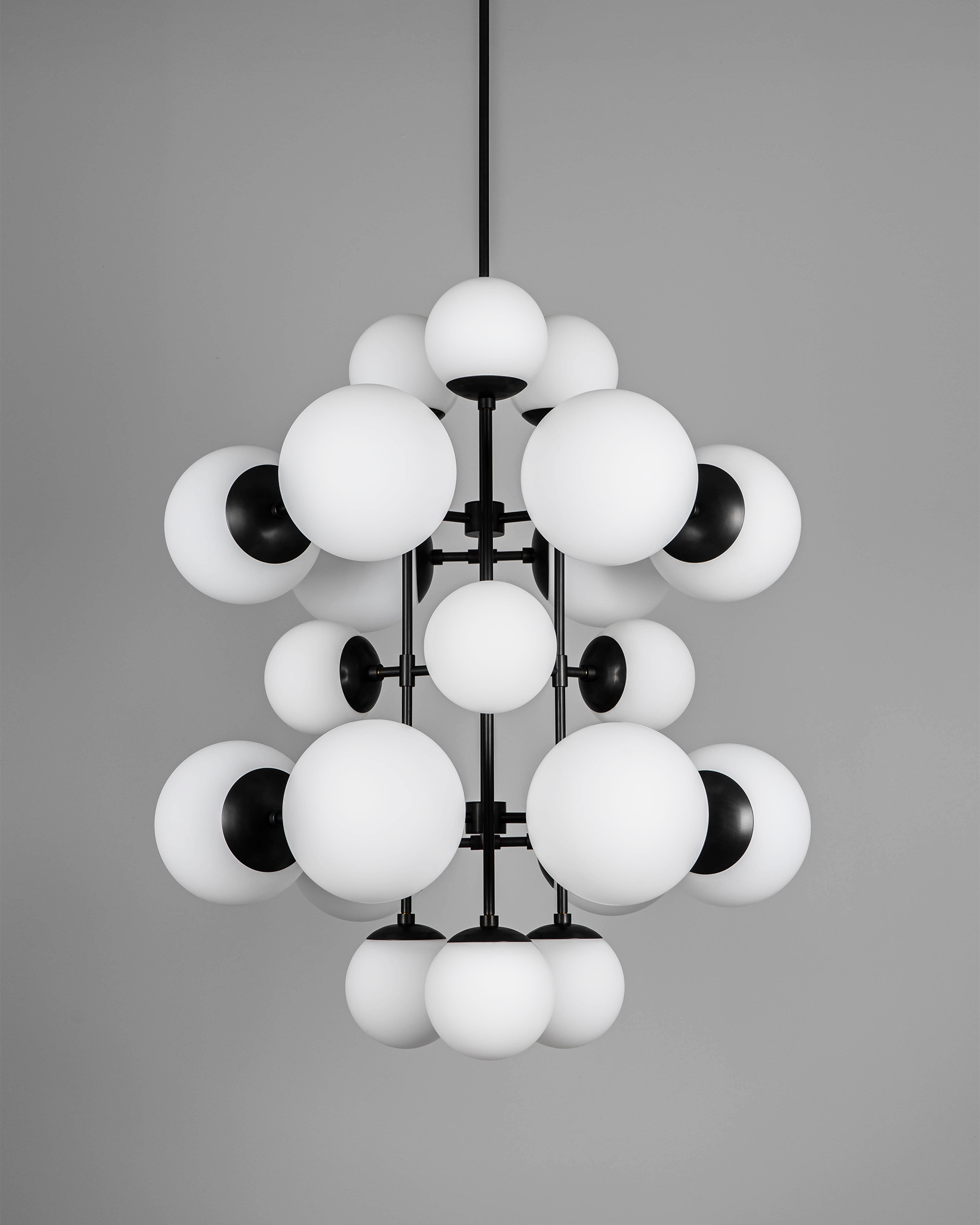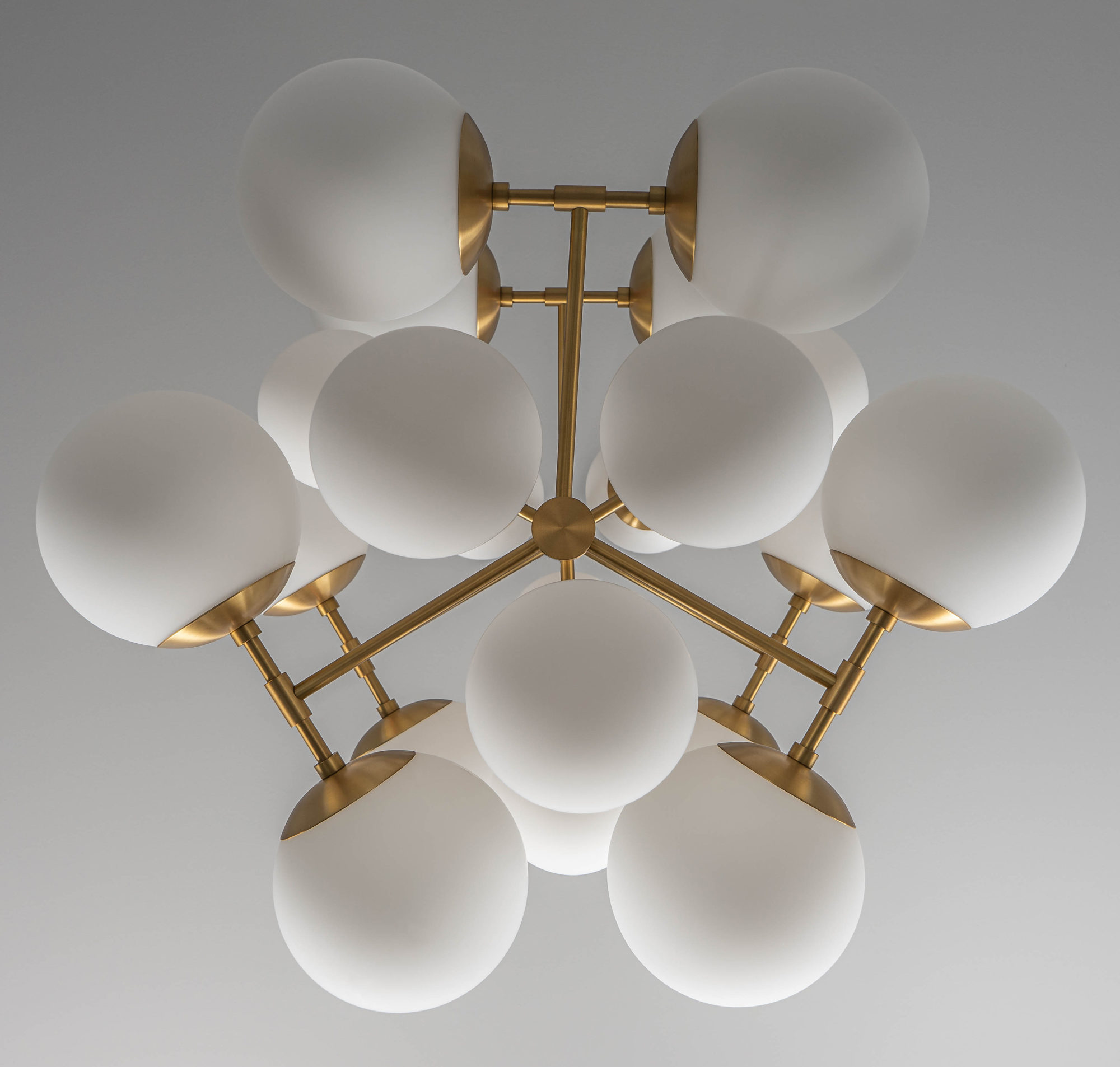 A kaleidoscope of glass spheres perambulates around a linear brass frame. Made with two sizes of glass globes, available in three types of signature glass, the shifting symmetries and enchanting interplay of configurations create changing patterns from every angle.
