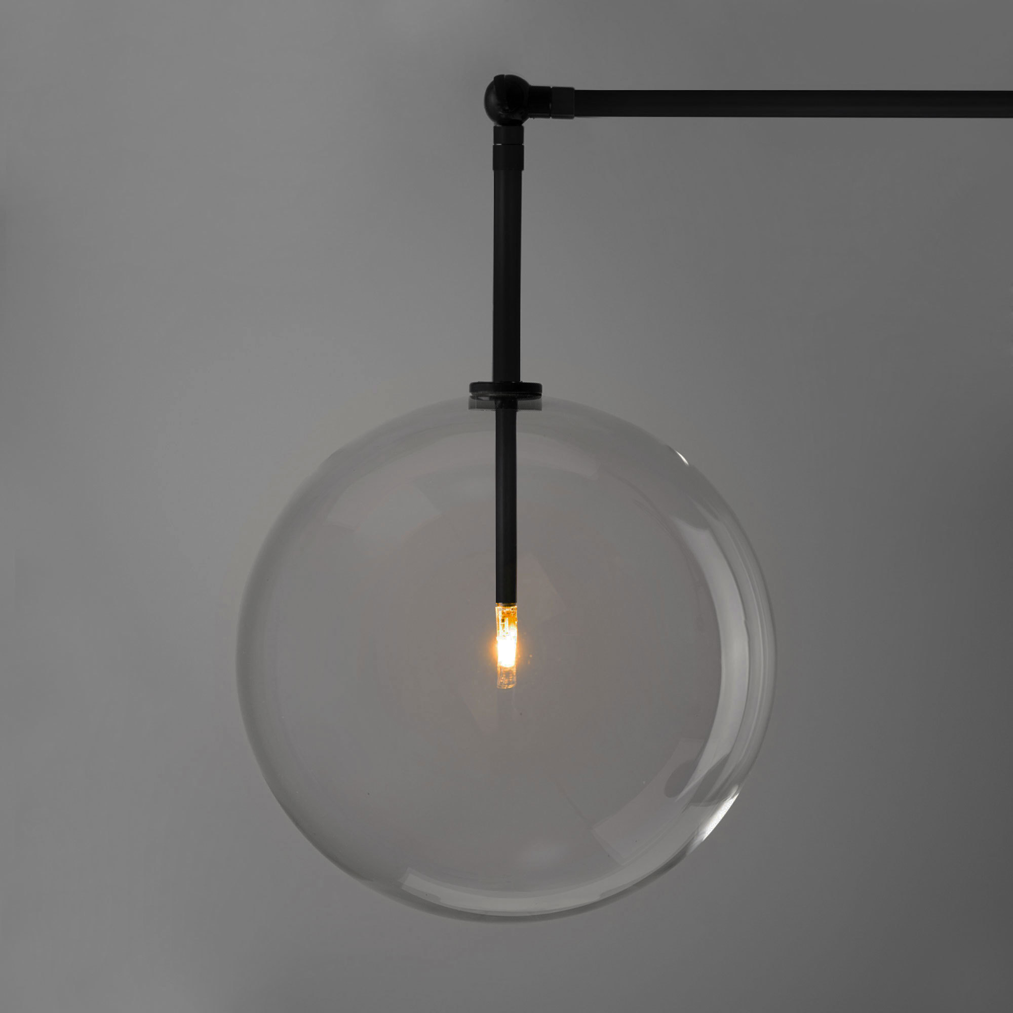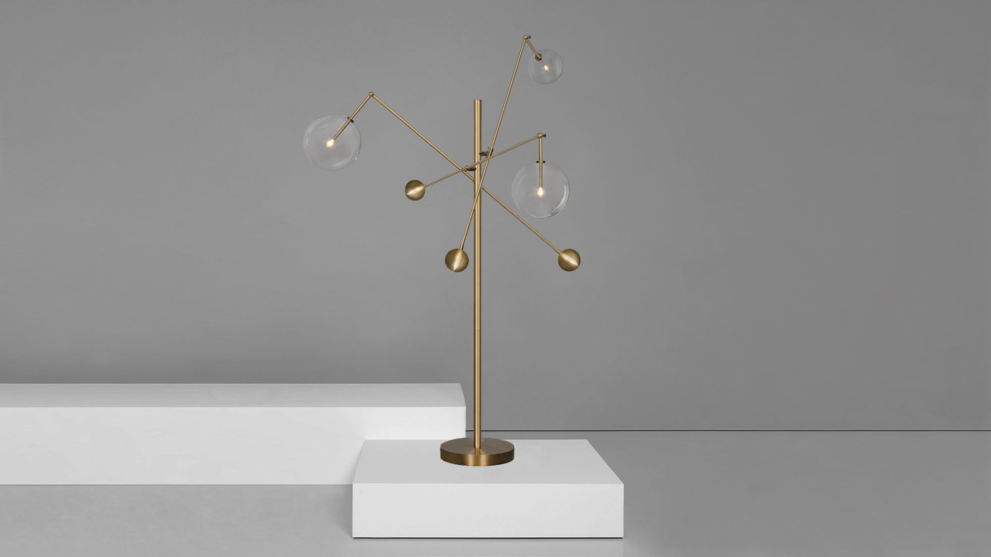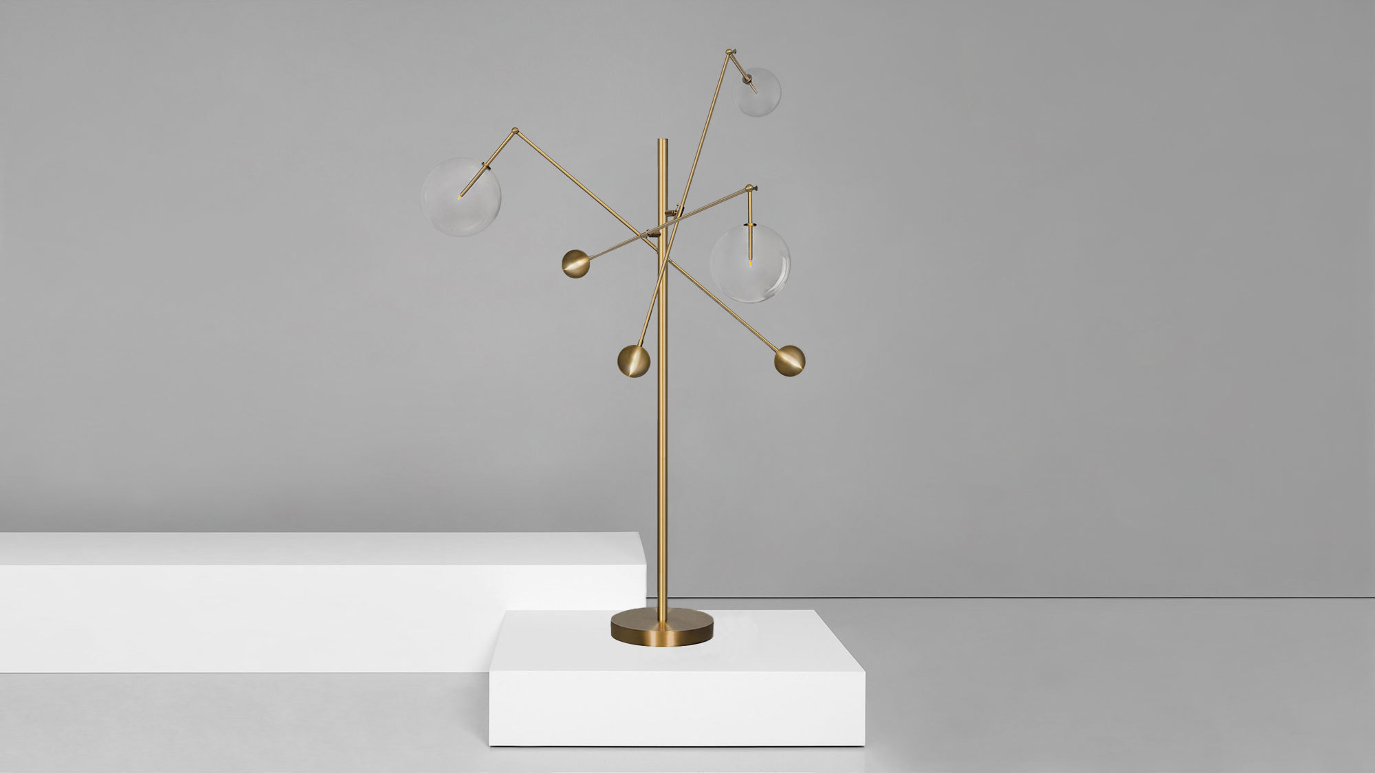 Three mouth-blown spheres upon cantilevered arms create an adjustable interplay of geometric angles. A free-standing lamp with a striking modular form, derived from the dynamic balance between illuminated glass globes and brass counterweights.
