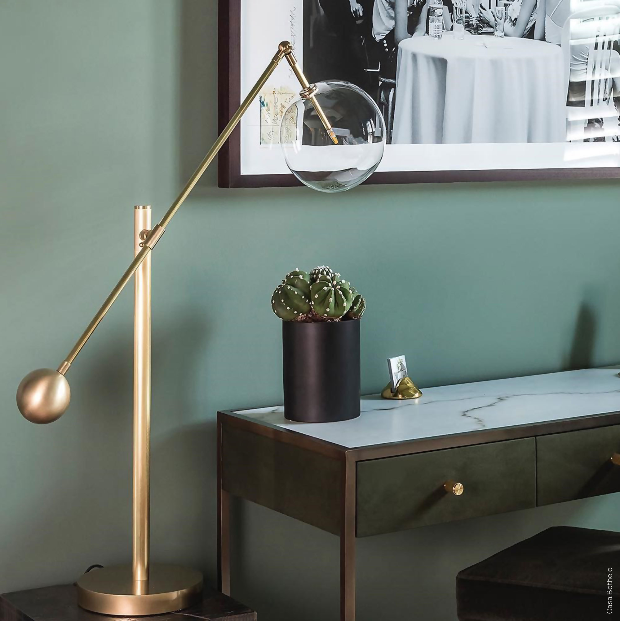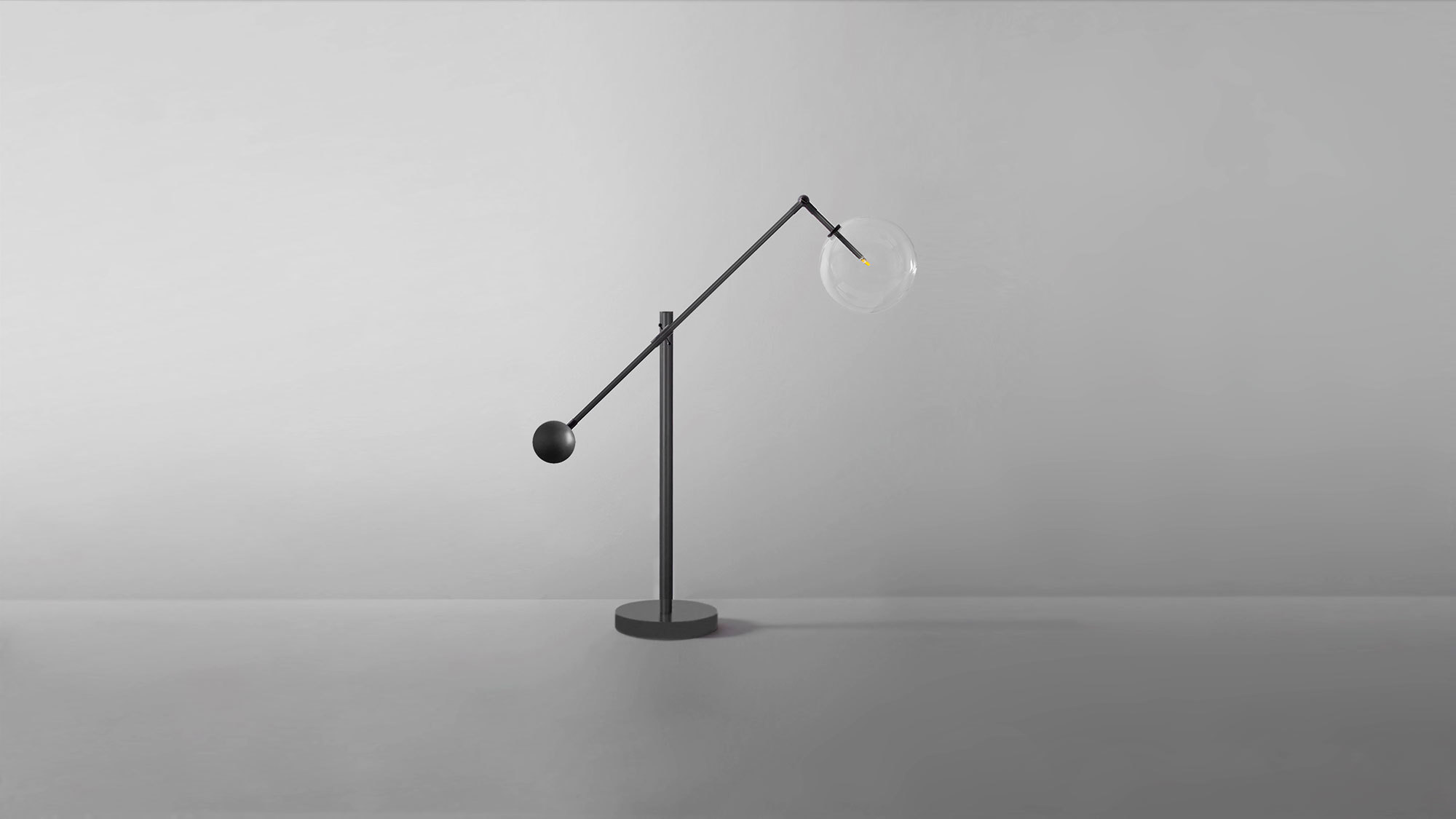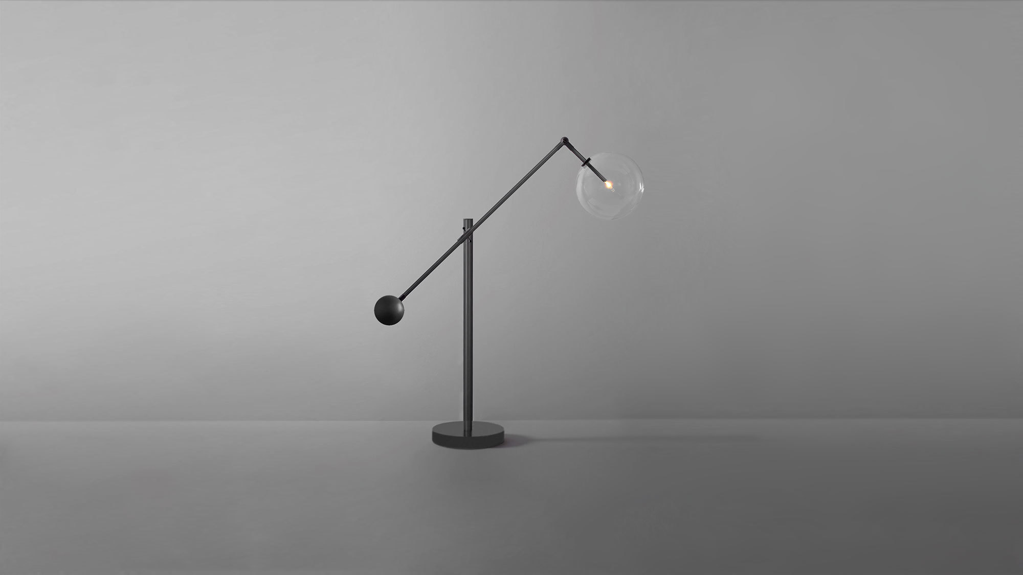This adjustable table lamp strips the classic cantilevered silhouette back to its bare essentials, retaining its sense of style and play. A striking, angular form, derived from the dynamic balance between illuminated glass globe and brass counterweight.