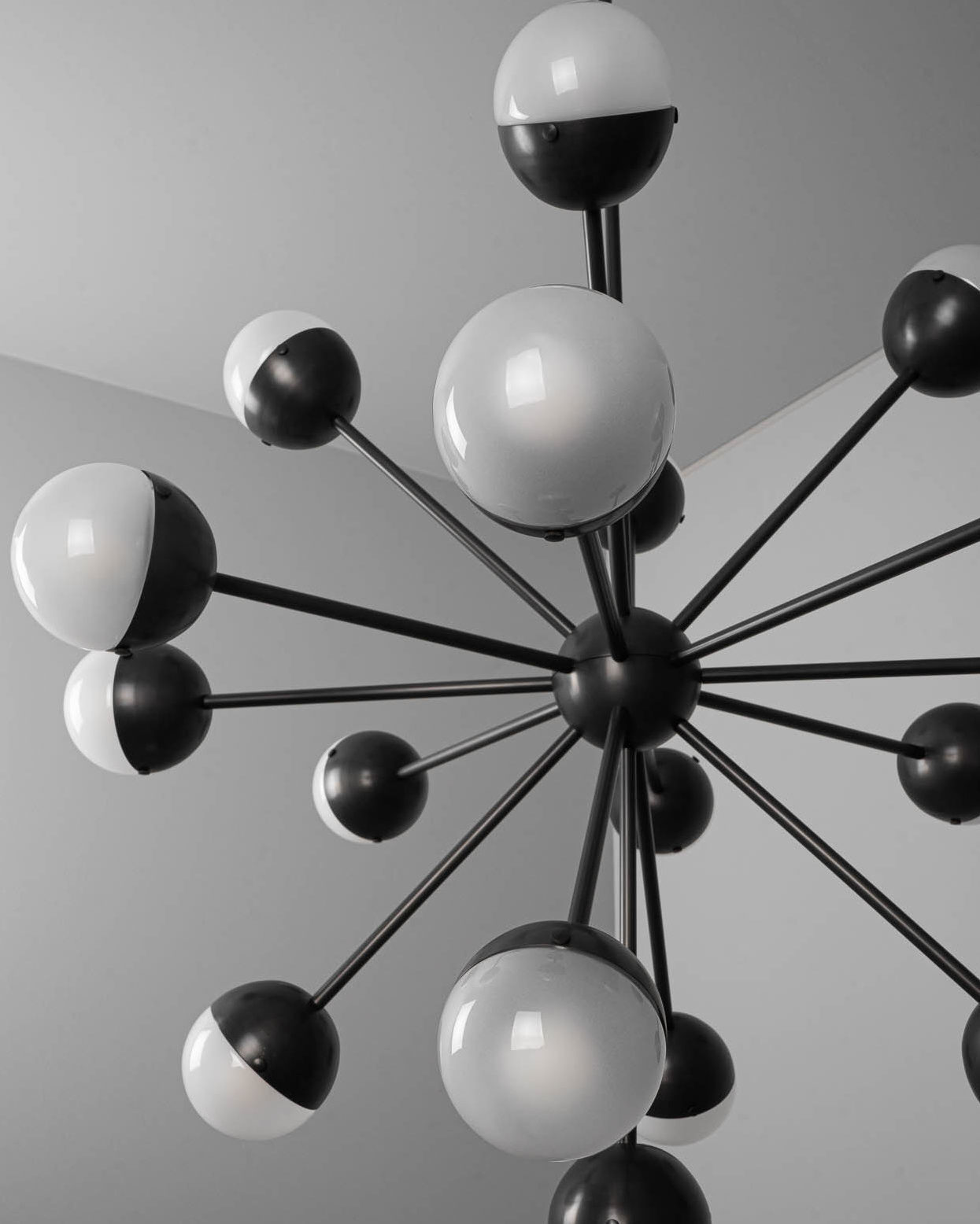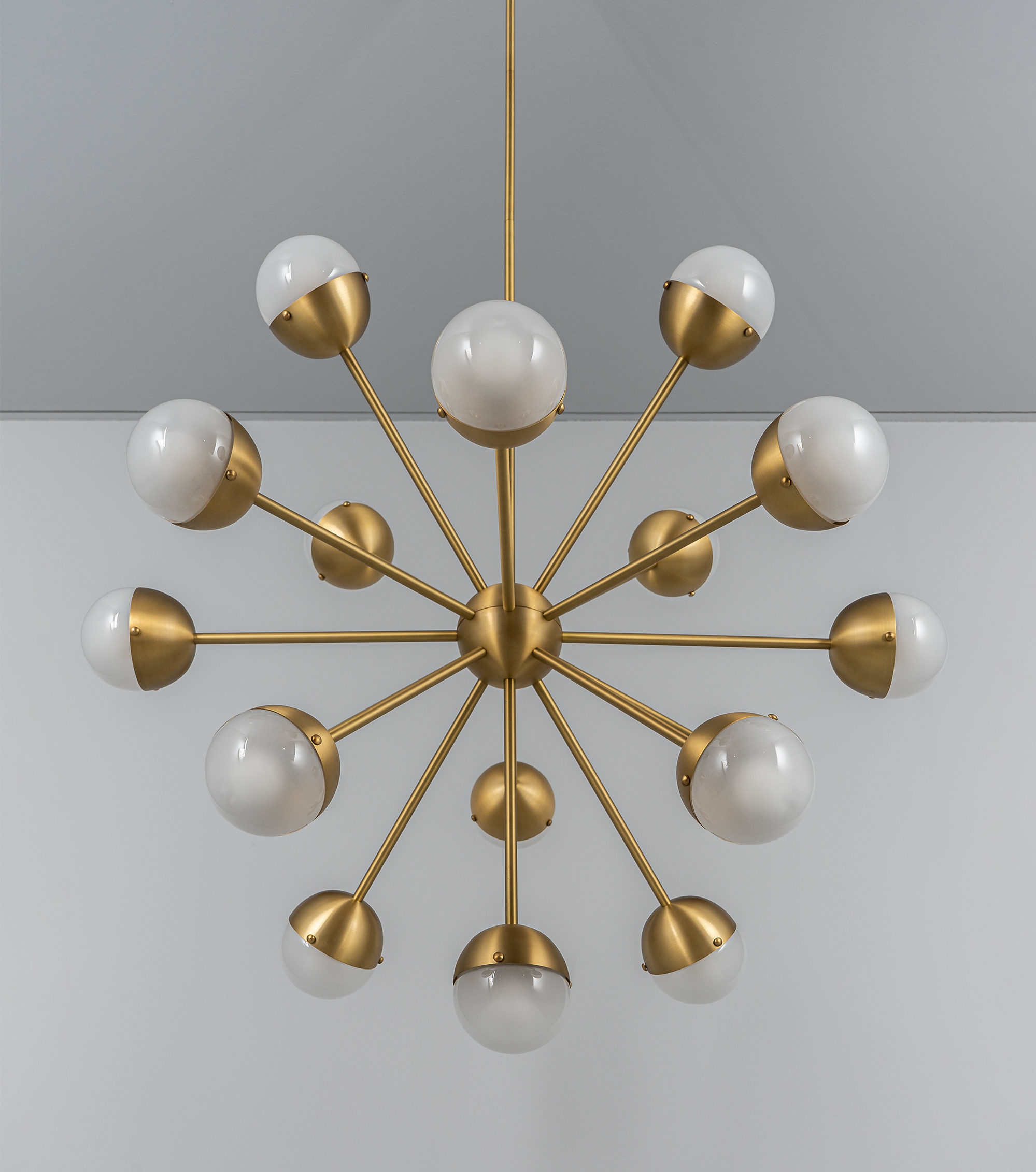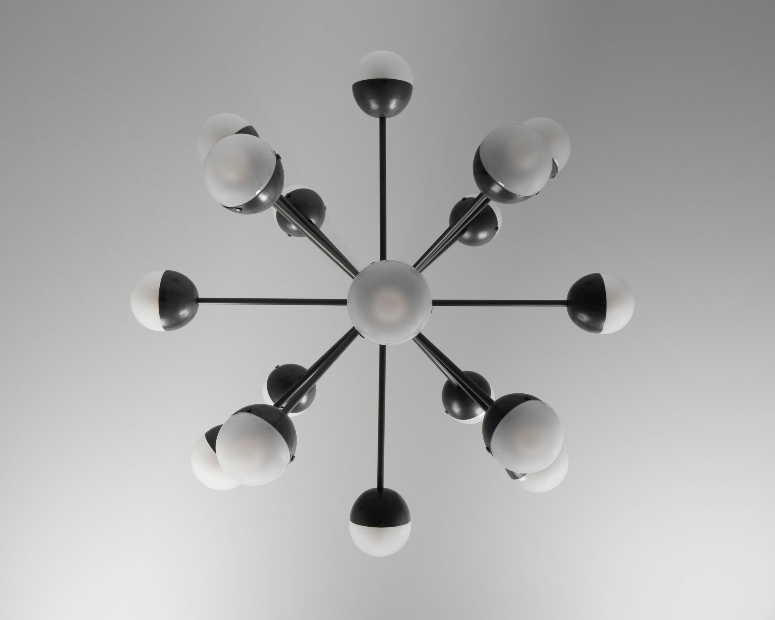 Sparks of light trail brass lines in a circular formation. Radiating out from a spherical nucleus, ten sprightly rods wield illuminated hemispheres, a spectacular spatial punctuation