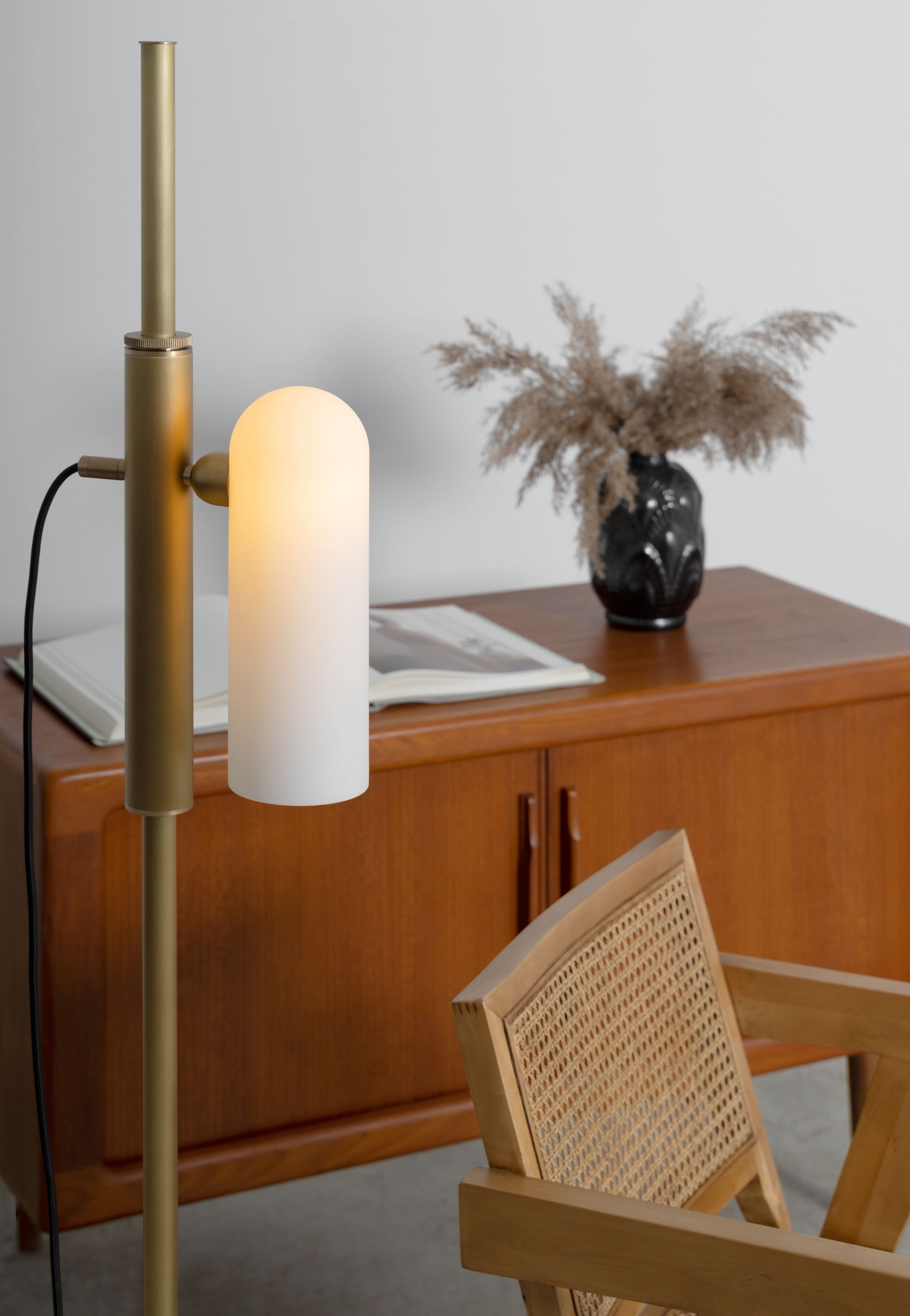 An elegant line topped with an elongated cylinder, can be adjusted as you please. Creating an intimate effect from minimal forms.