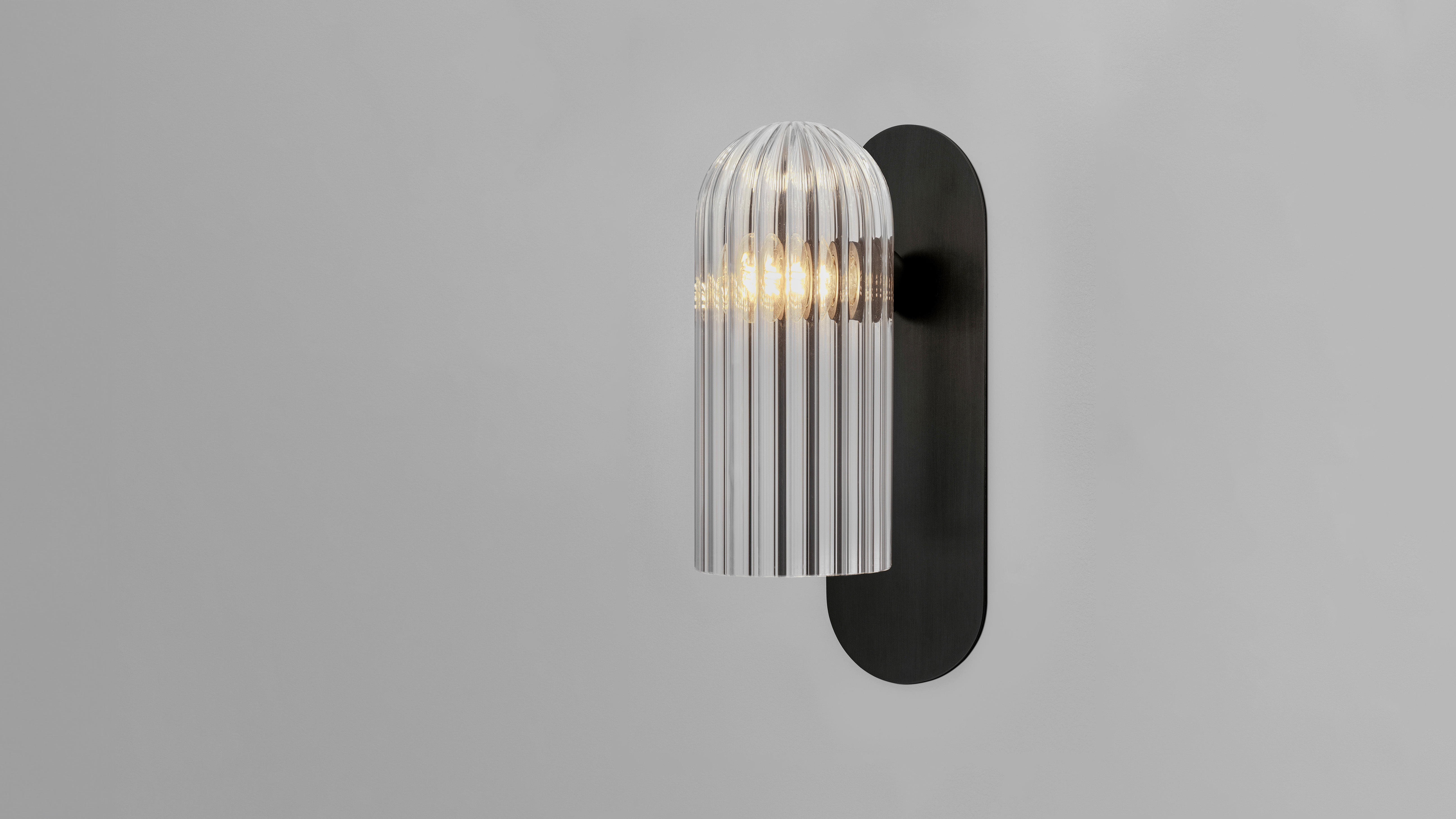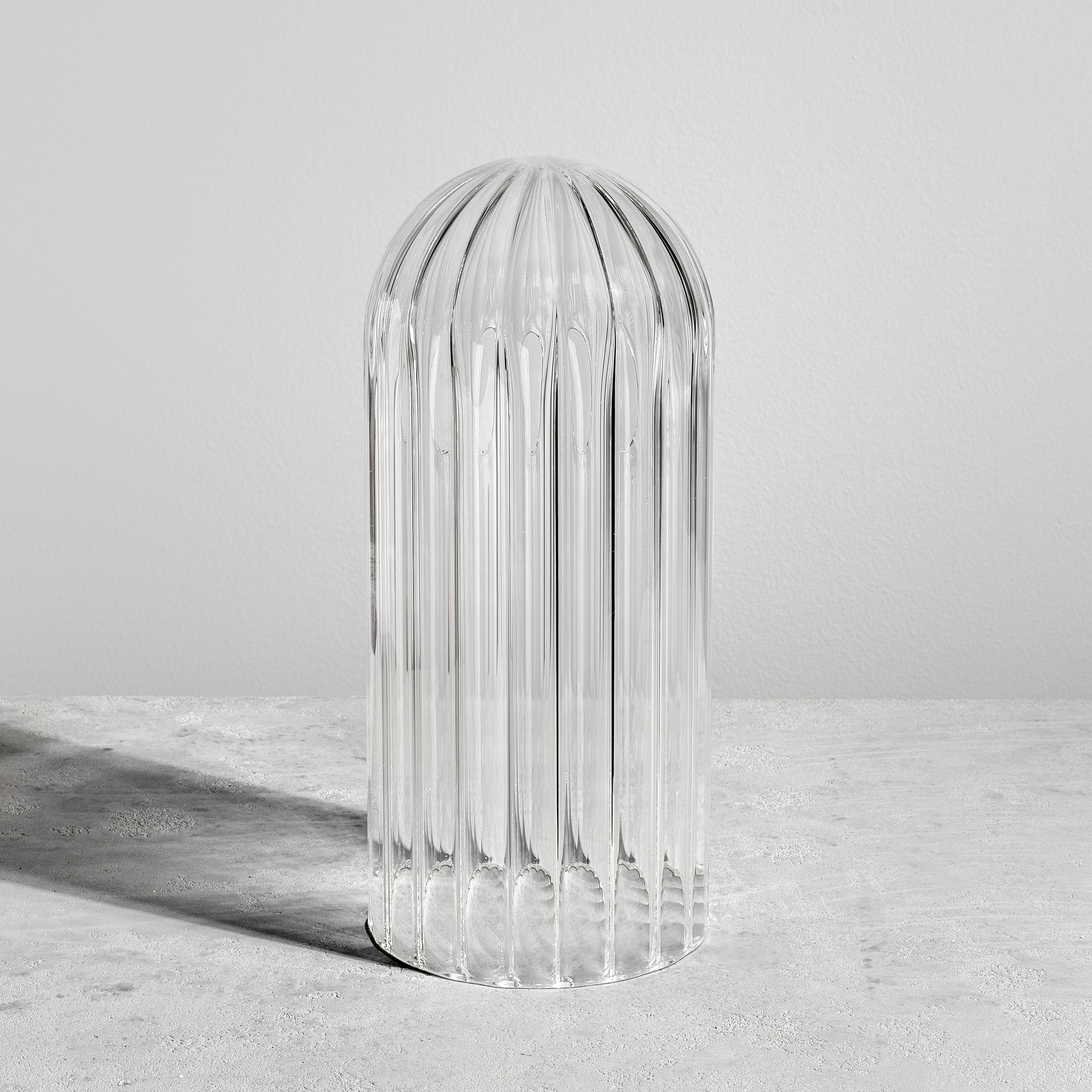 To display its graceful design, this illuminated fixture features a brass medium-sized plate seamlessly paired with a one-sized glass arched cloche, crafted from break-resistant borosilicate glass.