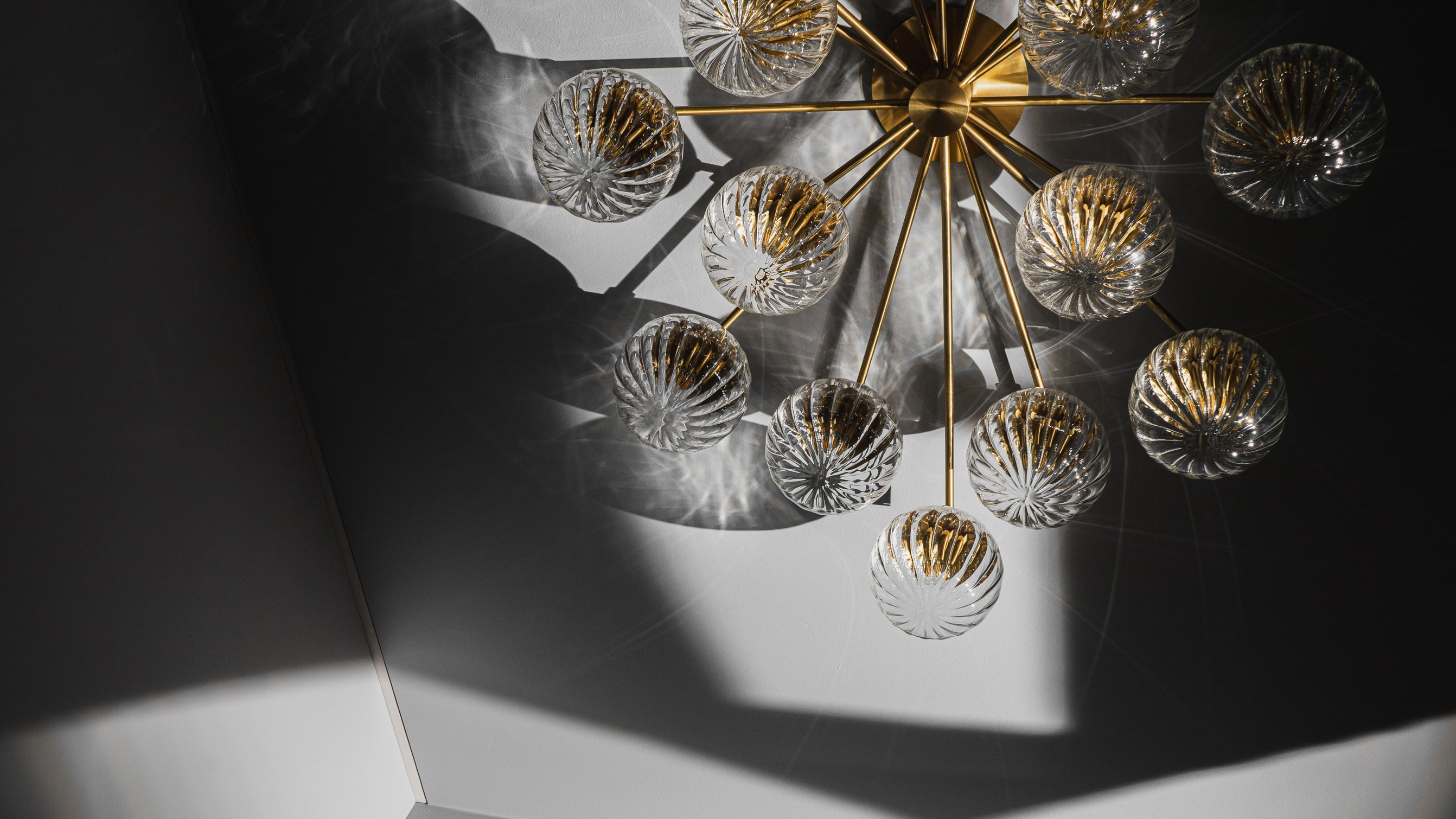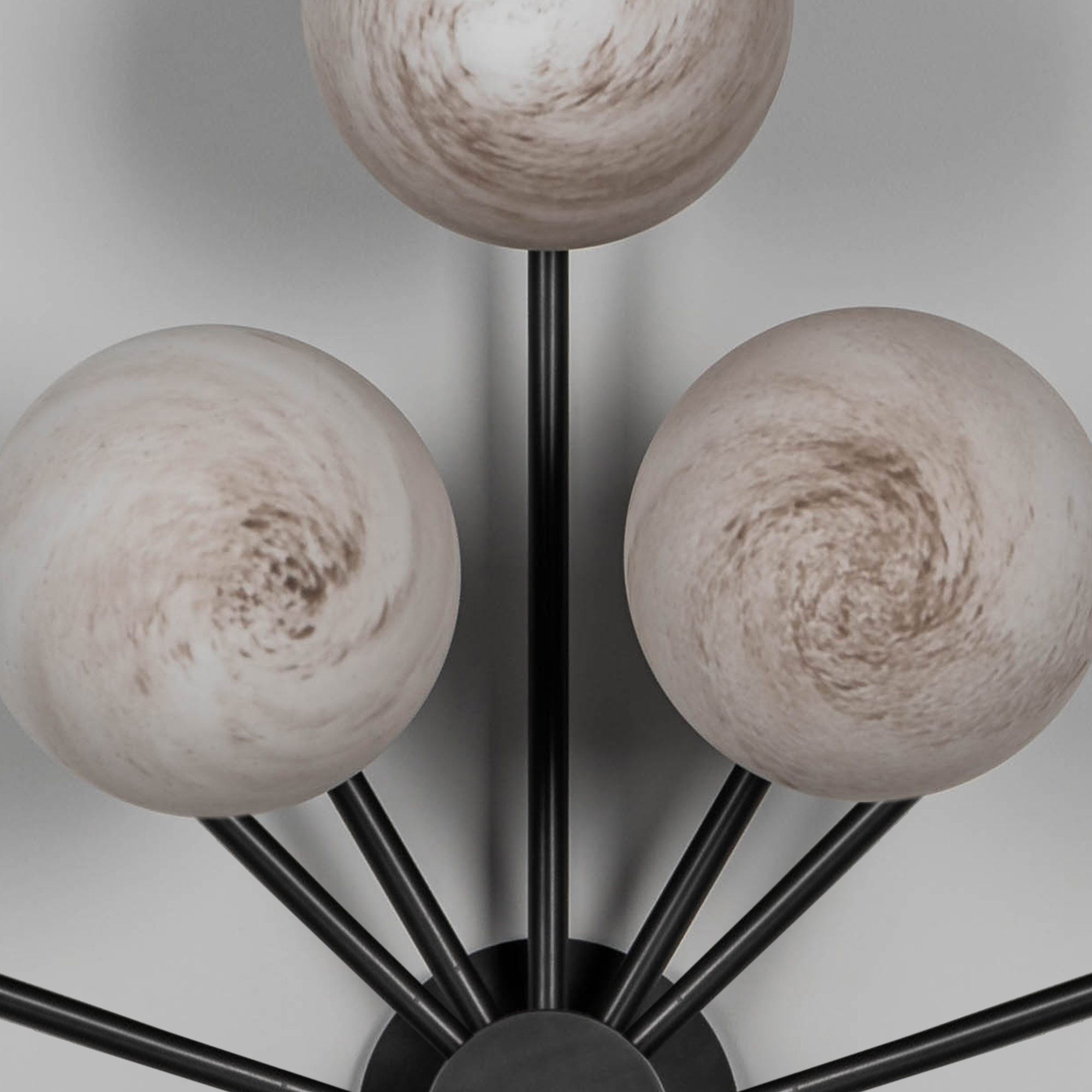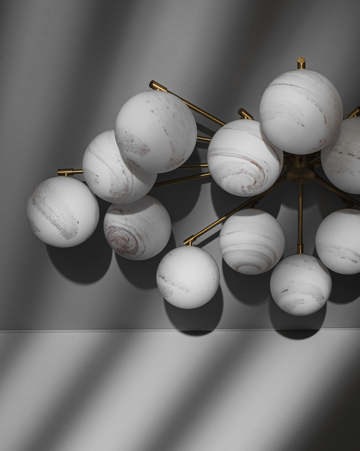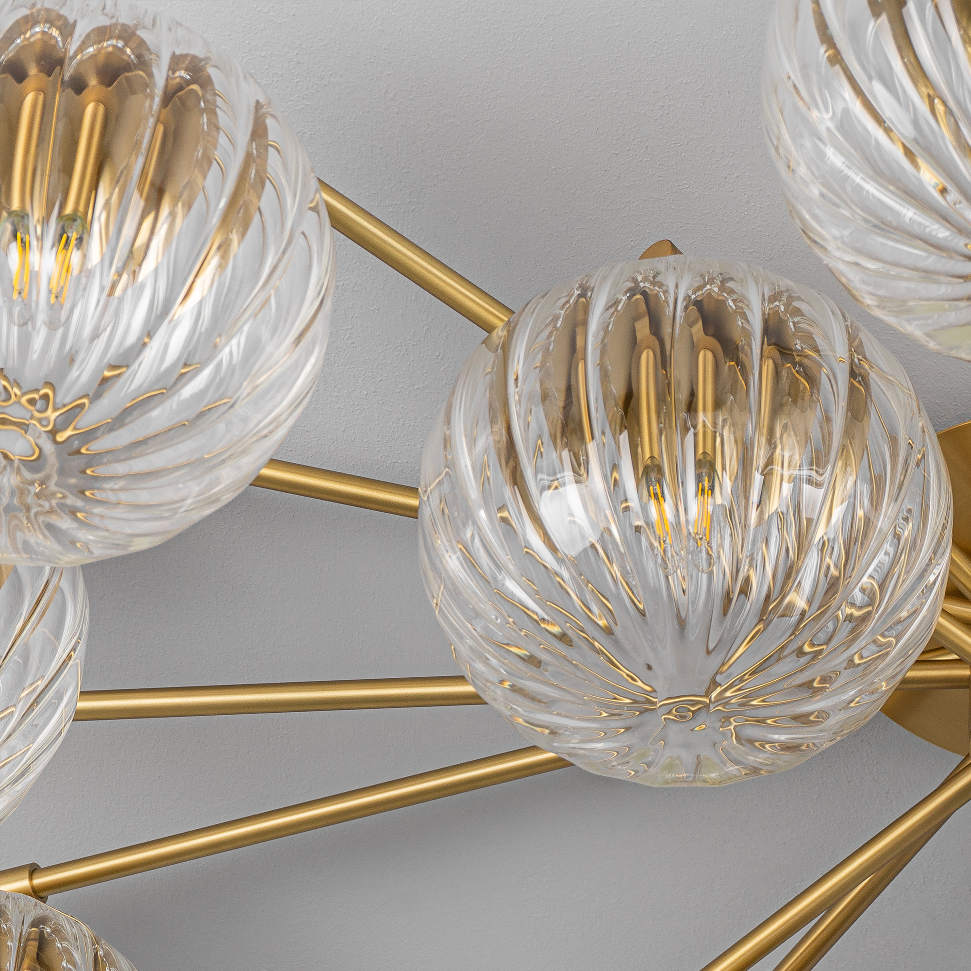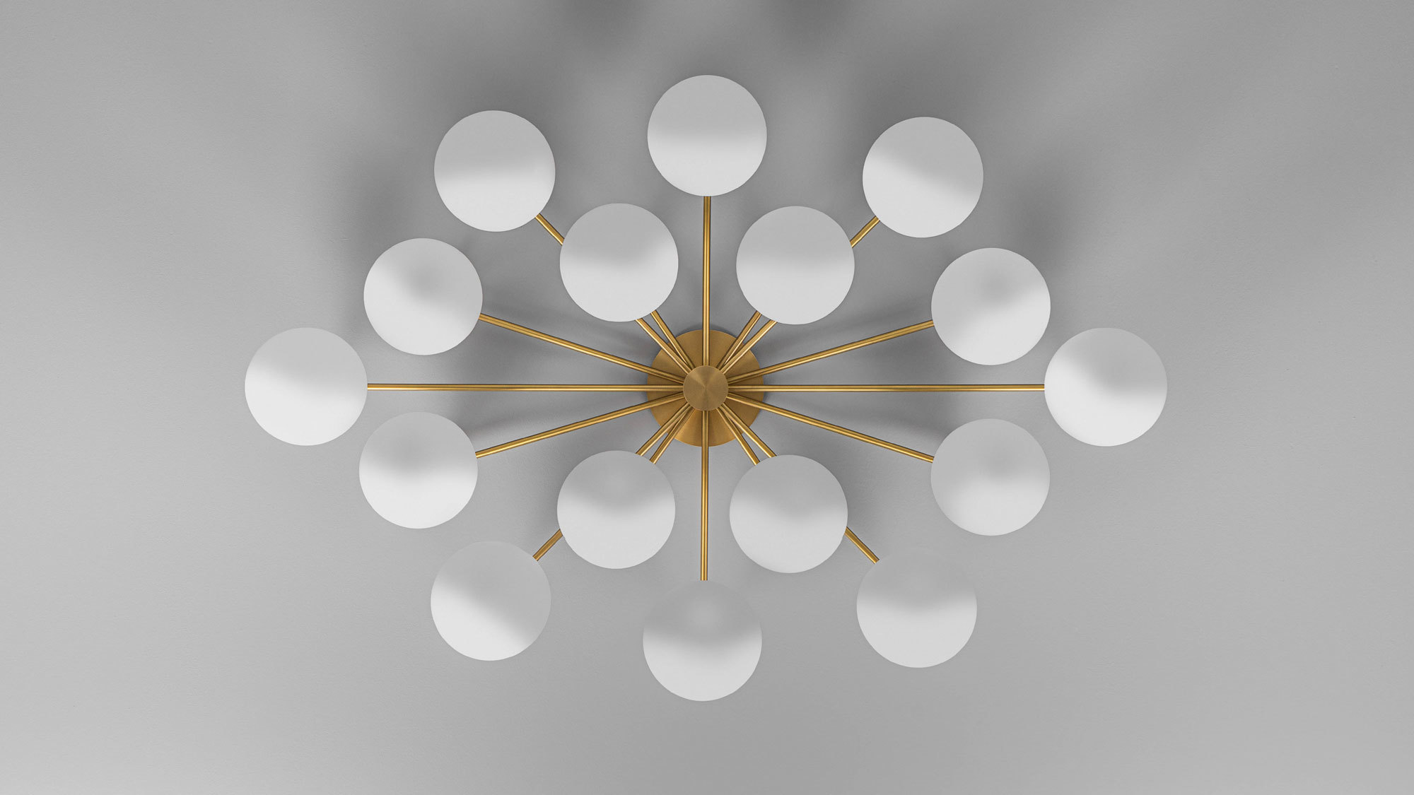 This oval arrangement of lights explodes into a brass and glass sunburst, spreading across the ceiling. A constellation of illuminated globes linked to a central axis creates a space-defining sculptural impression. The flush mount base gives this majestic chandelier special adaptability.