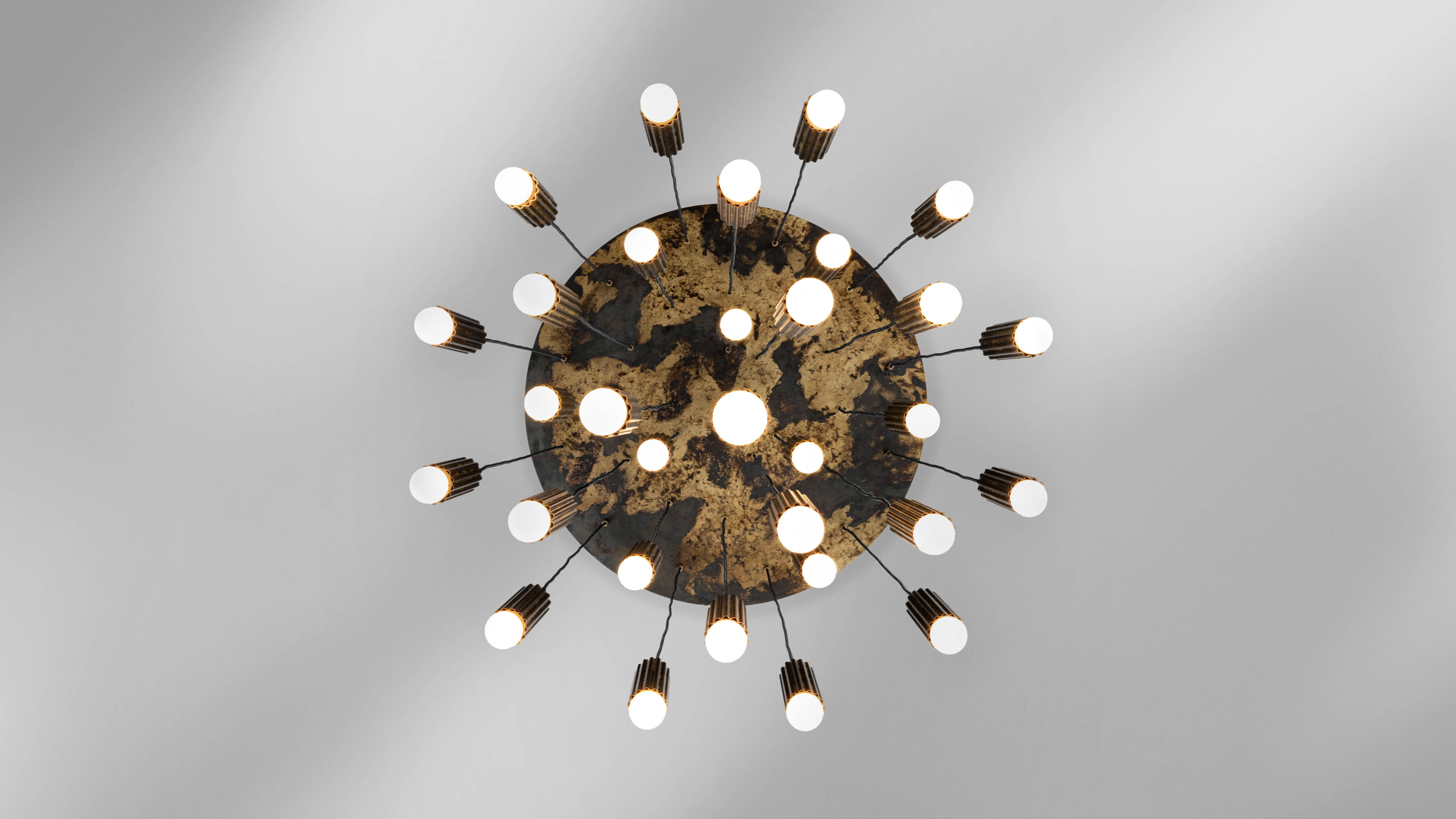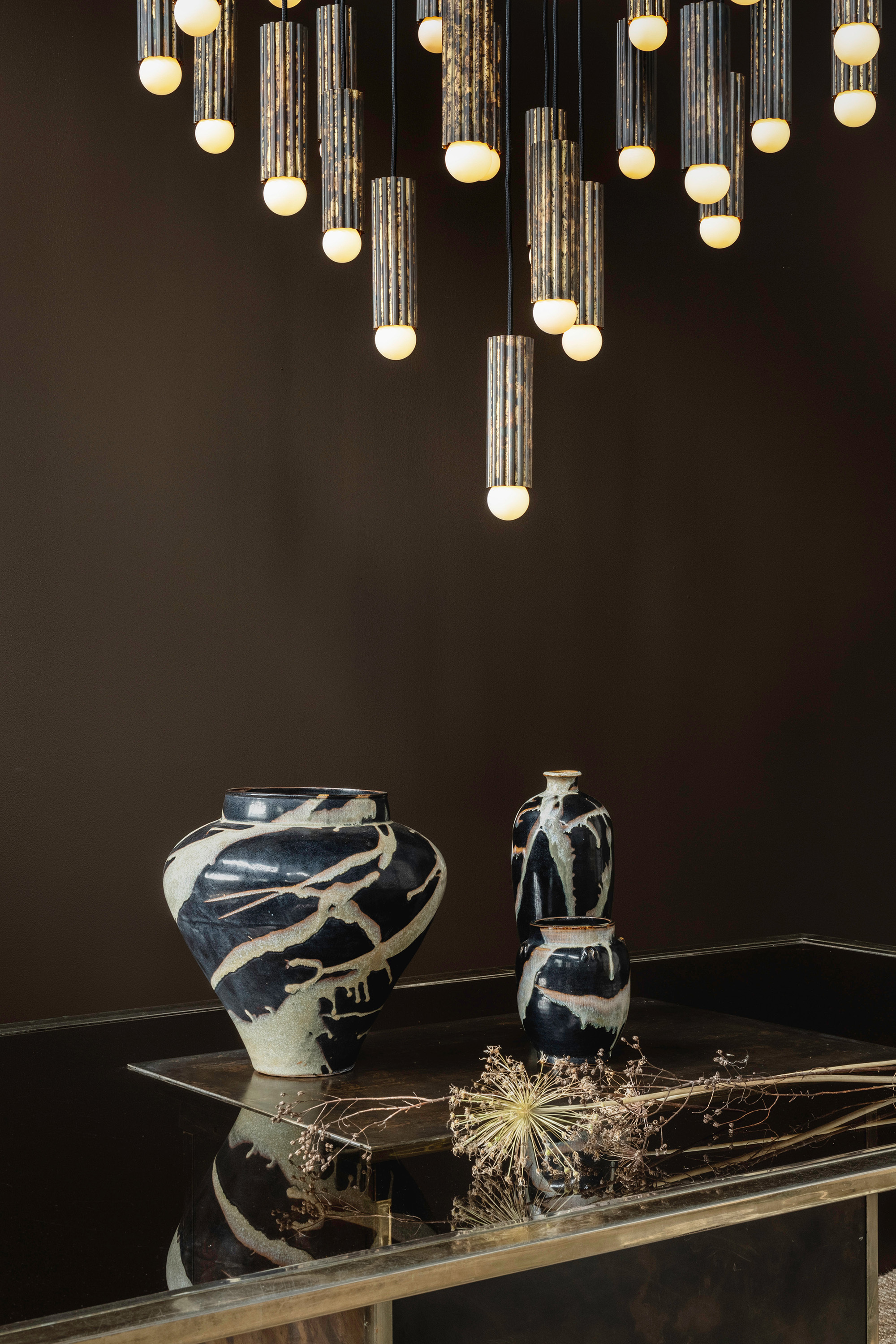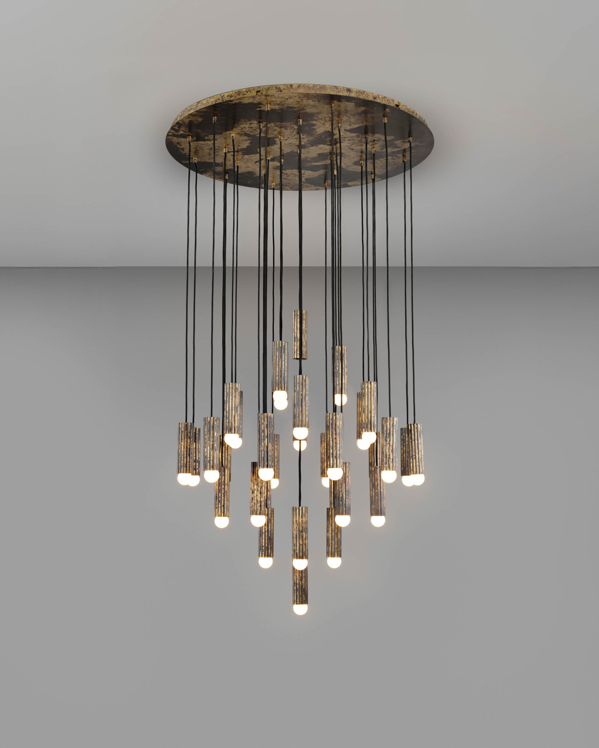 Thirty-two fluted solid brass cylinders are suspended in diamond formation, and a constellation hovering in space. From the side, vertical lines unfold in suspended harmony; from below, a celestial map of light emerges. Sculptural, commanding, and atmospheric, Vesta Cluster 32 radiates presence from every angle.