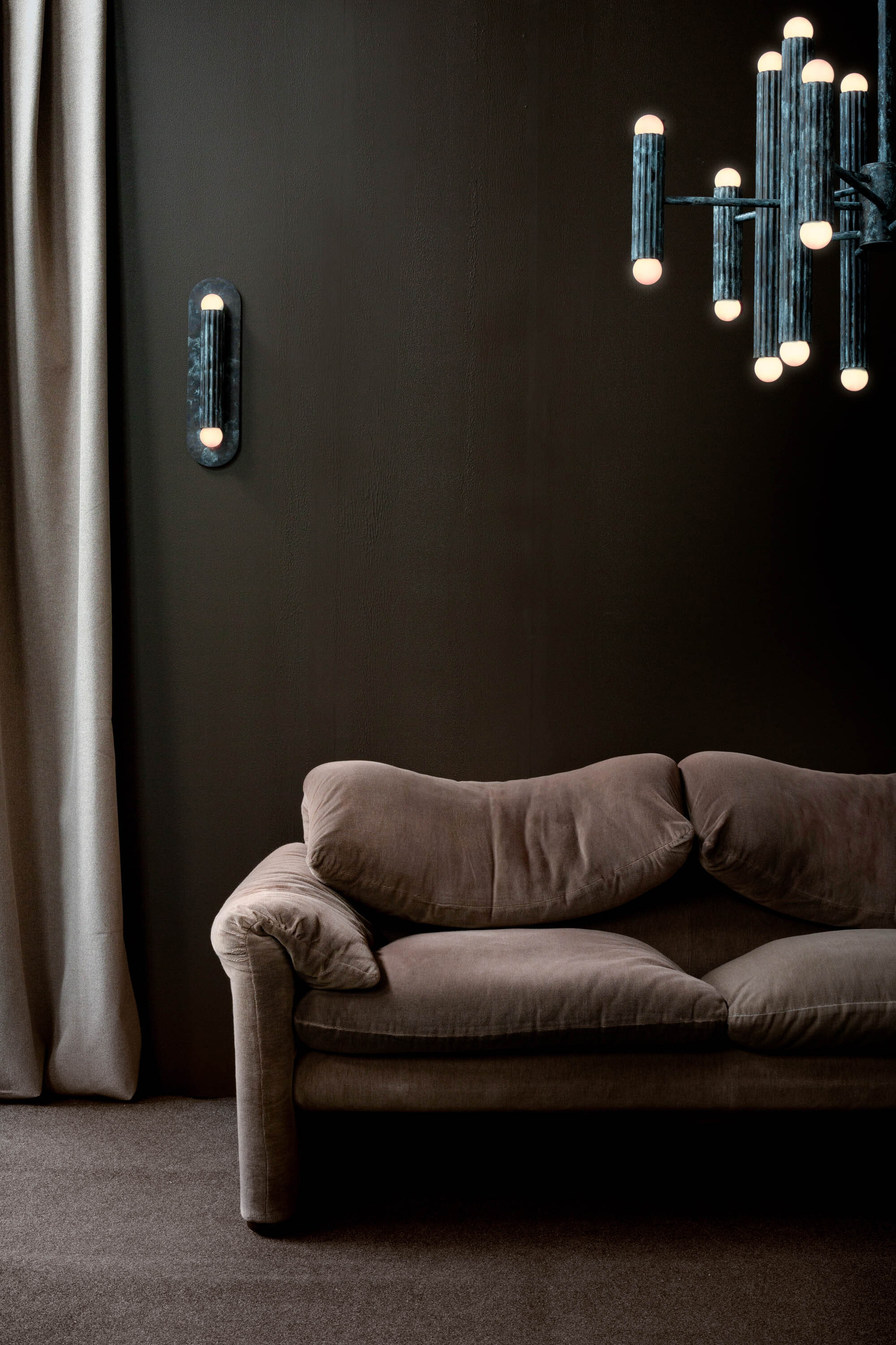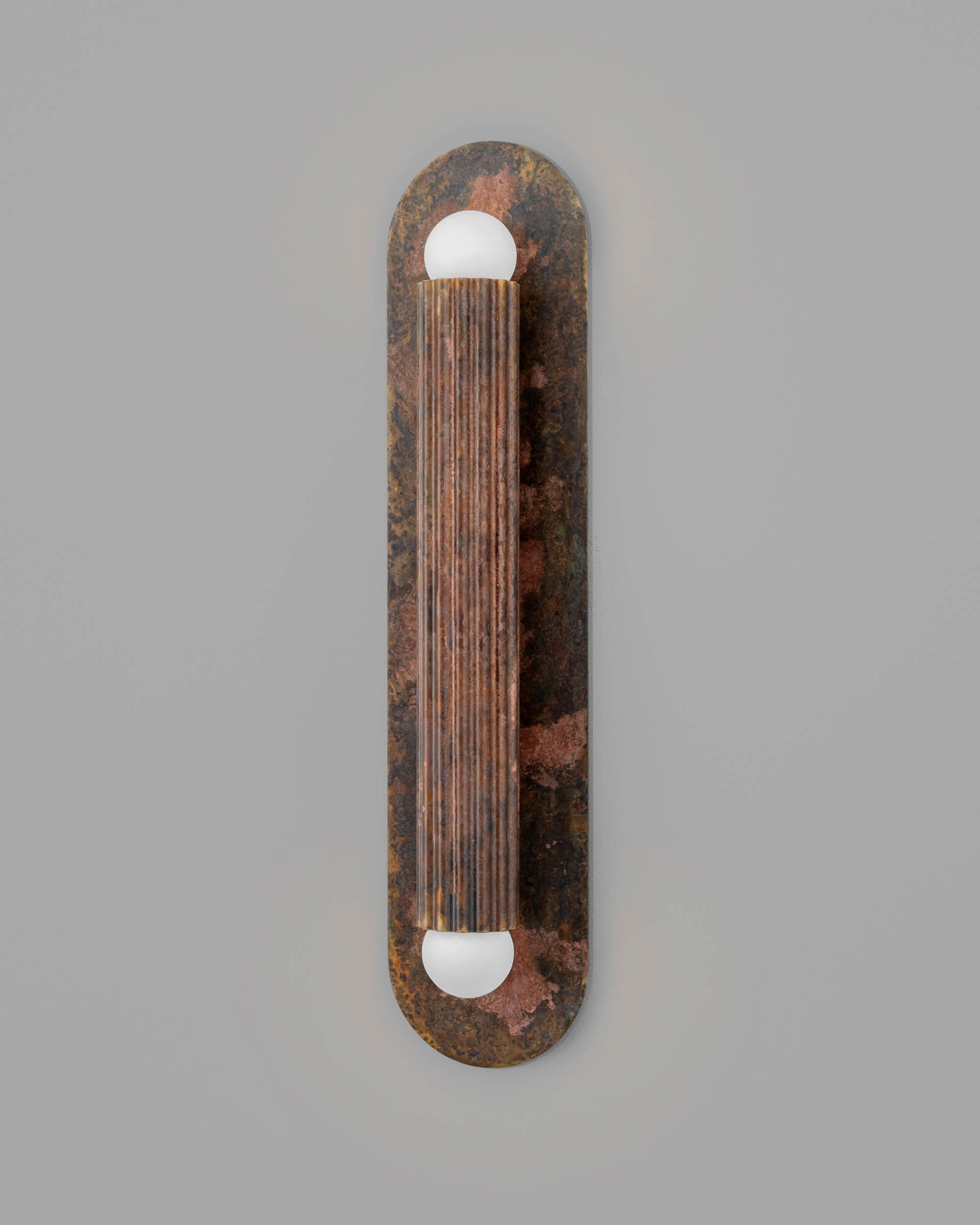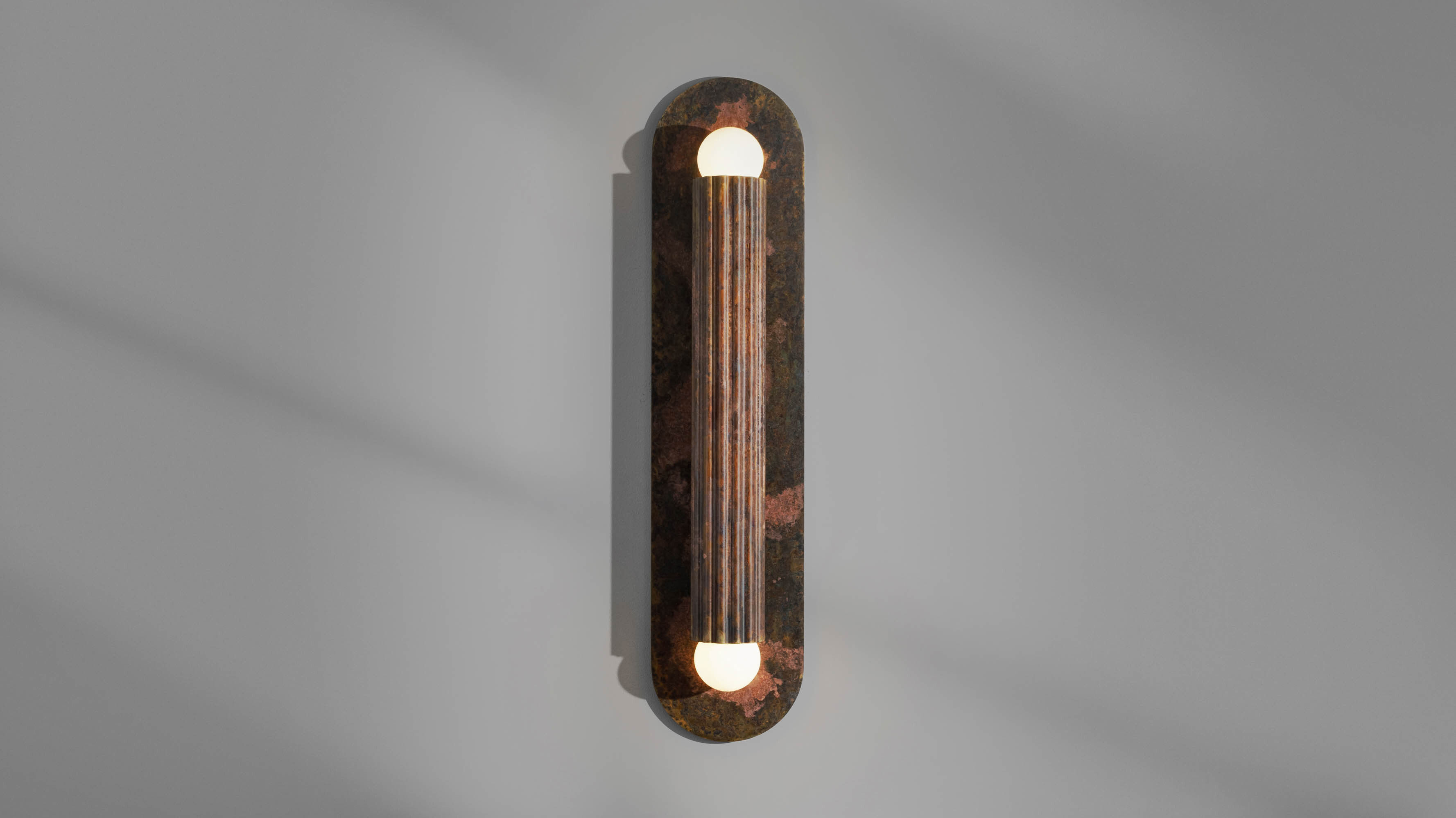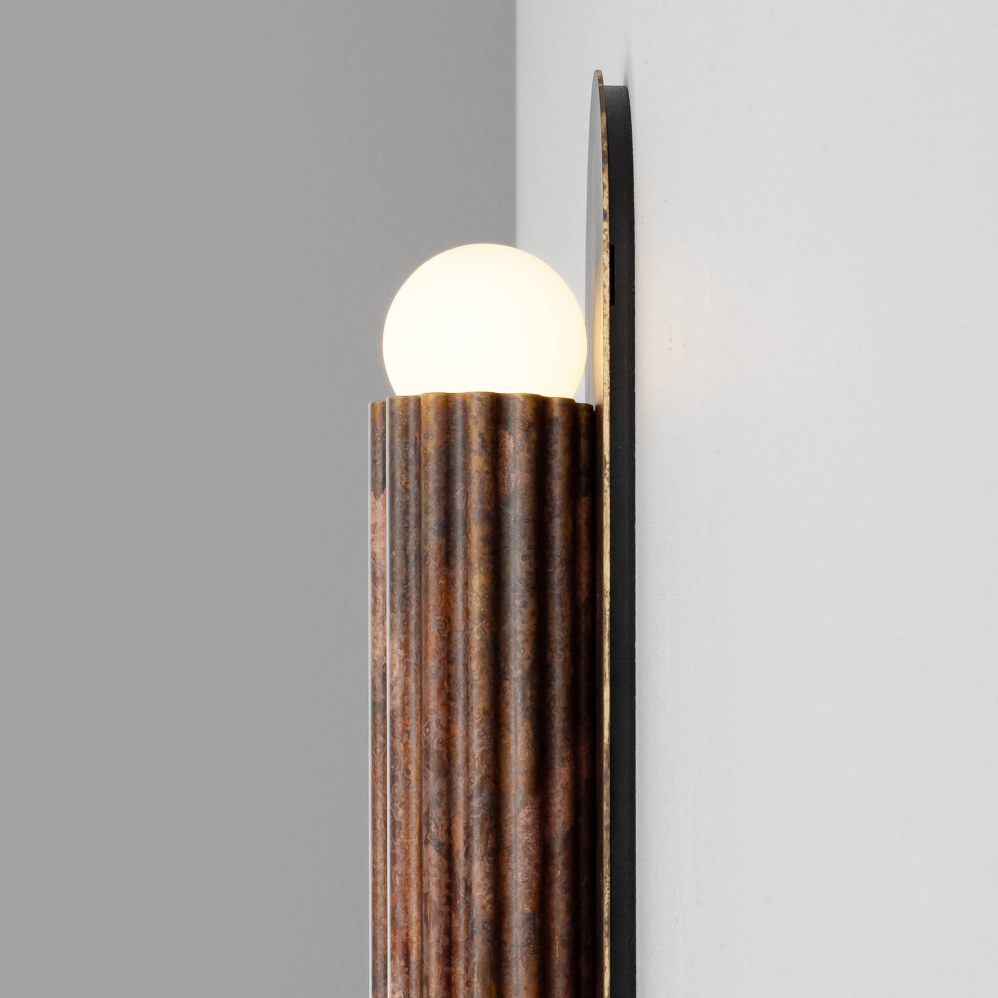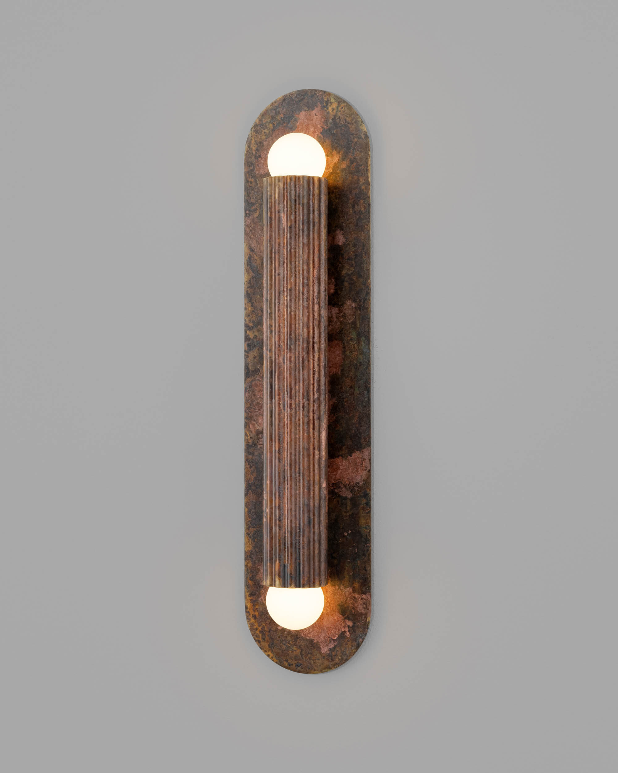A single fluted cylinder rests on an oval plate, its geometry distilled to pure form. Entirely crafted in solid brass, it captures light as it ripples across the vertical lines, casting warmth, depth, and quiet intensity. Mounted as a wall sconce or flush fixture, it becomes a subtle guardian of atmosphere - architectural in presence, yet serene in glow.