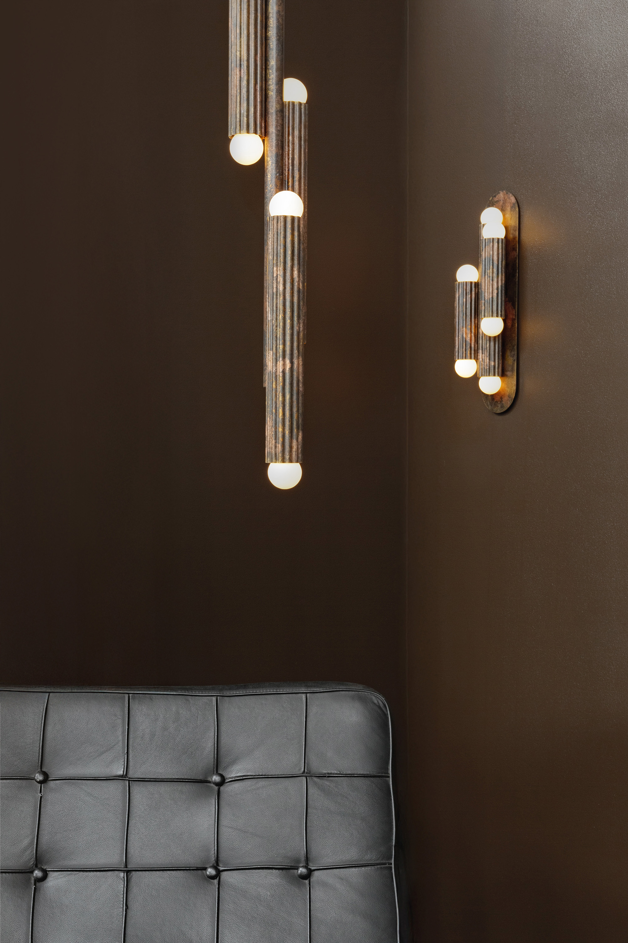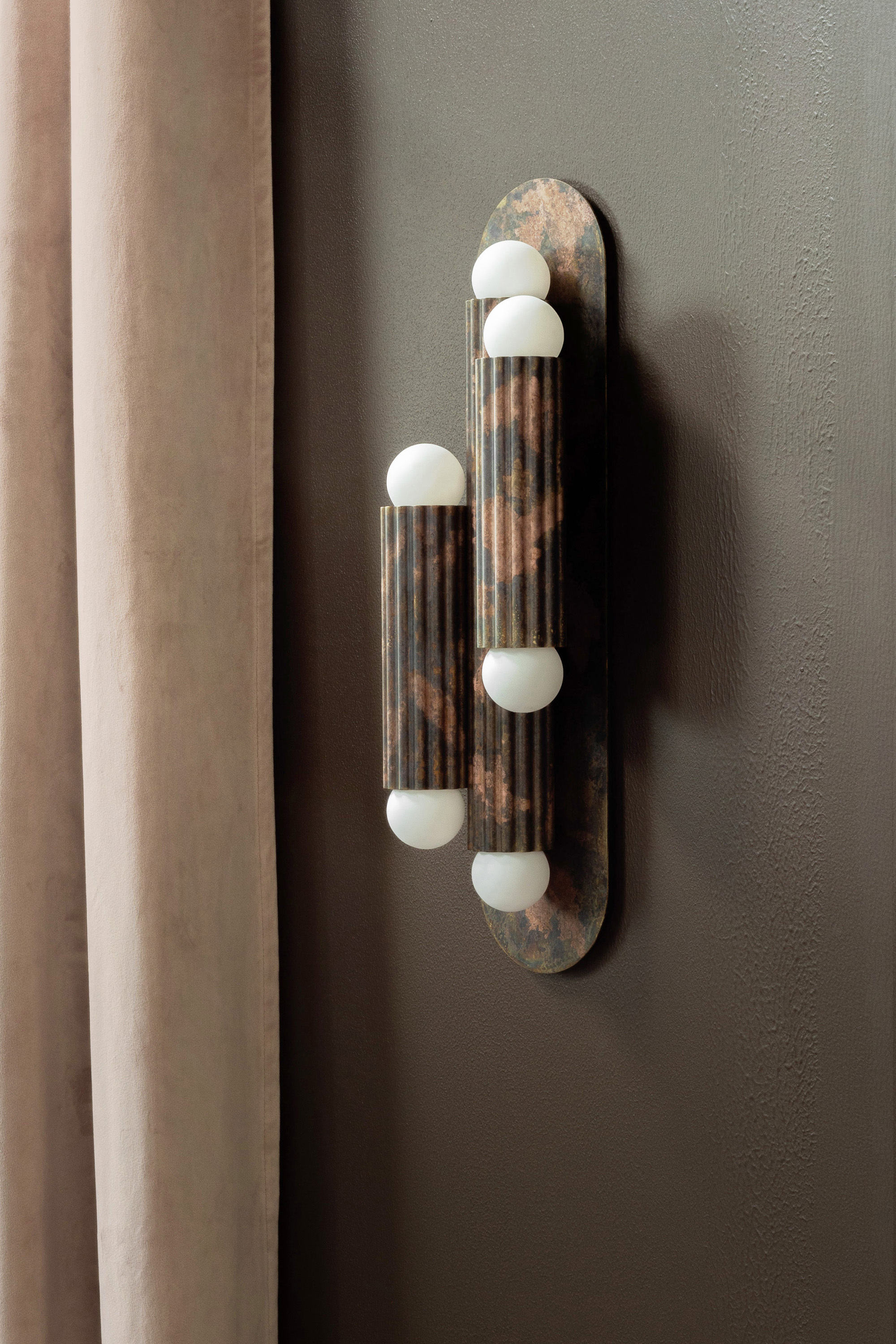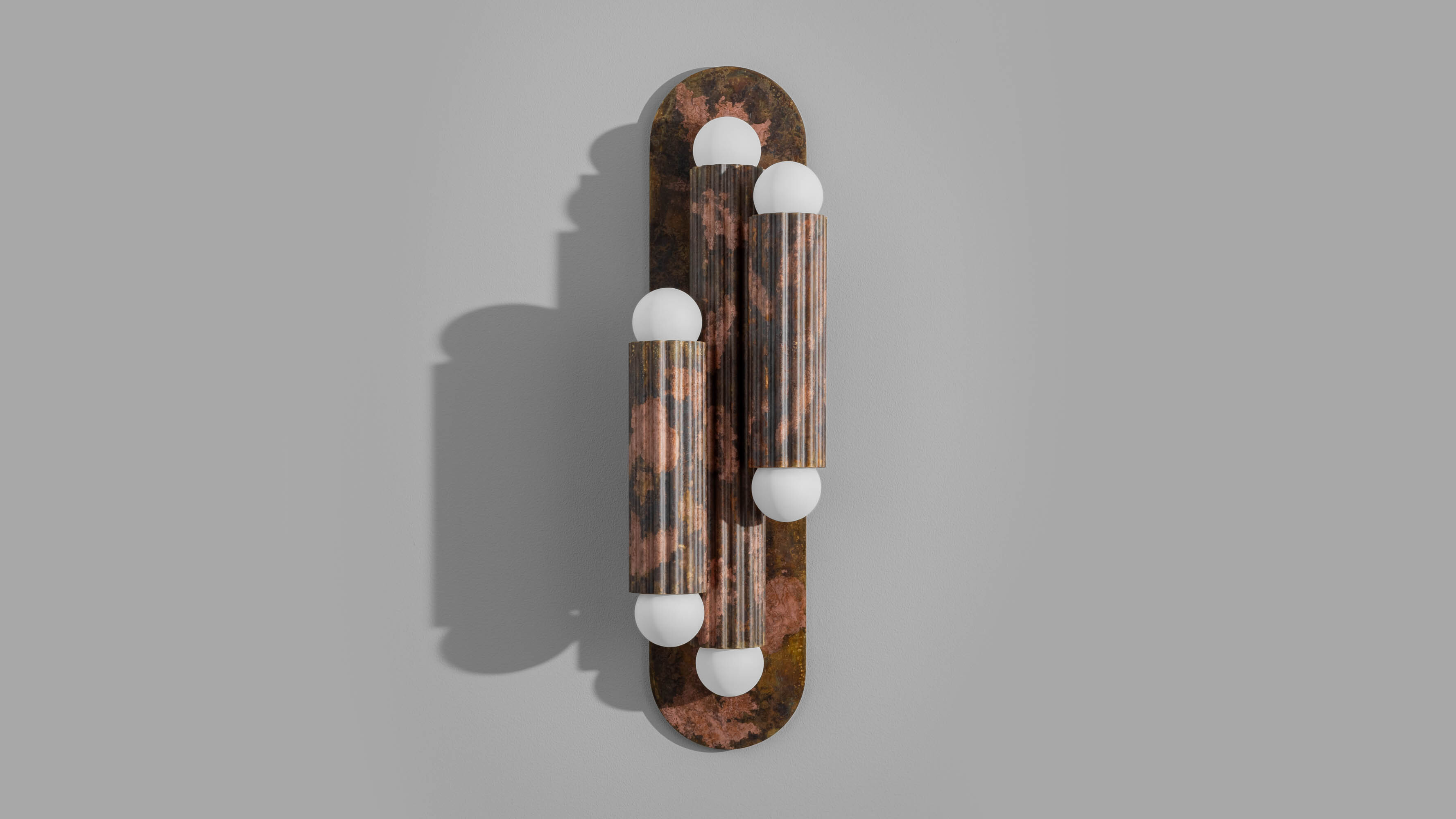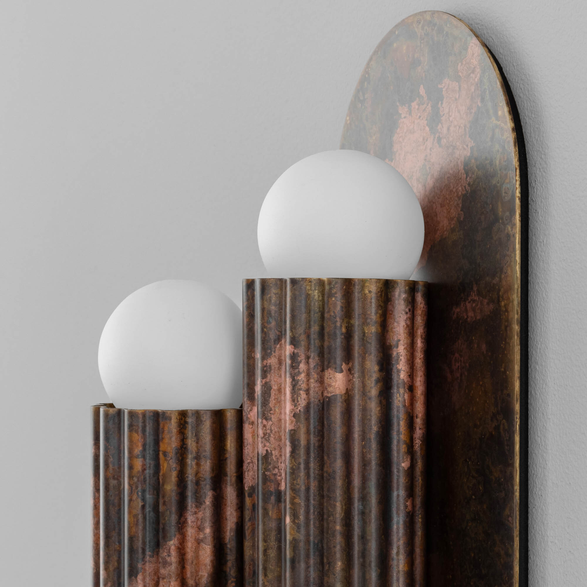 A study in sculptural rhythm, with a subtle modern reflection on brutalism. Three cascading fluted cylinders appear to float upon an oval plate, uniting classical depth with refined minimalism. Mounted as either a wall sconce or flush fixture, this solid brass composition radiates a finely balanced light - bringing measured radiance to the space and shaping the mood with a considered glow.